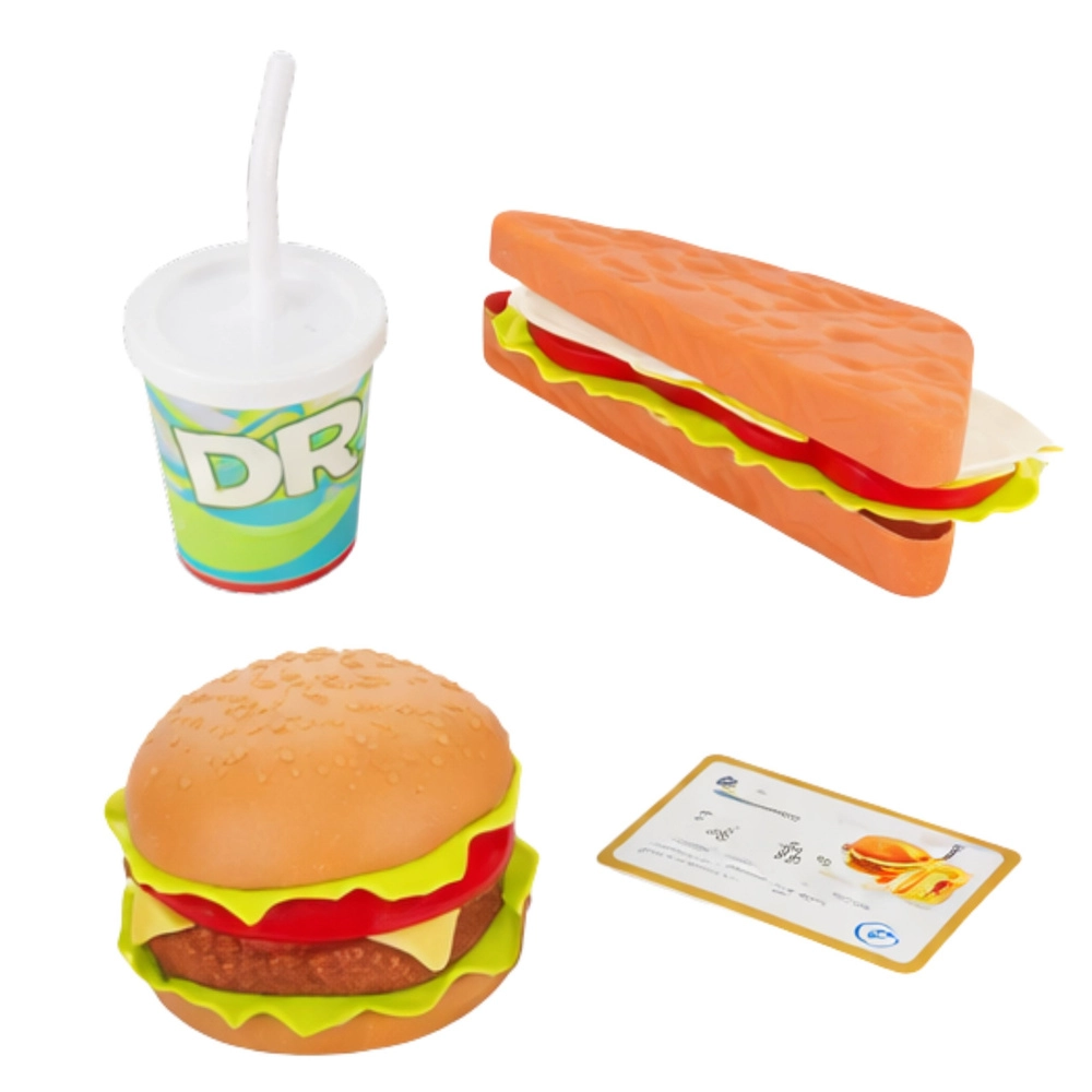 Un burger, une baguette et une boisson complètent le scénario du restaurant. Les enfants peuvent commander, servir et payer – une expérience complète de restauration rapide.
