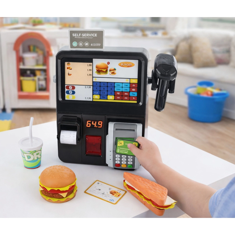 Caisse interactive pour enfants pour jouer au magasin et au restaurant, offrant un divertissement réaliste avec des effets lumineux et sonores. Les enfants peuvent biper les articles avec le scanner, imprimer un ticket de caisse et payer via un terminal de paiement. Grand écran couleur, accessoires riches avec nourriture de fast food et conception robuste pour stimuler l’imagination, la communication et la motricité fine.