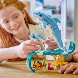 Le set contient 542 pièces et offre aux enfants comme aux adultes fans de l’océan la possibilité de créer, d’explorer et d’exposer. Construisez un dauphin adulte avec son petit voguant gracieusement sur la vague au-dessus d’un récif corallien coloré, ou reconstruisez le modèle en un hippocampe avec base richement décorée et coquillage articulé, ou encore en un crabe avec méduse et flore marine.