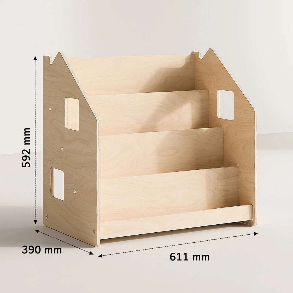 Pratique étagère à livres pour enfants en contreplaqué de bouleau de qualité, elle favorise l’autonomie en lecture et maintient l’ordre dans la chambre. Grâce à l’exposition frontale claire des couvertures, les enfants choisissent facilement leur livre préféré et le remettent simplement en place après lecture. Elle offre 4 étagères spacieuses et un espace de rangement arrière pour livres ou jouets, présente une construction robuste et sûre aux bords arrondis et est finie avec un vernis à base d’eau.