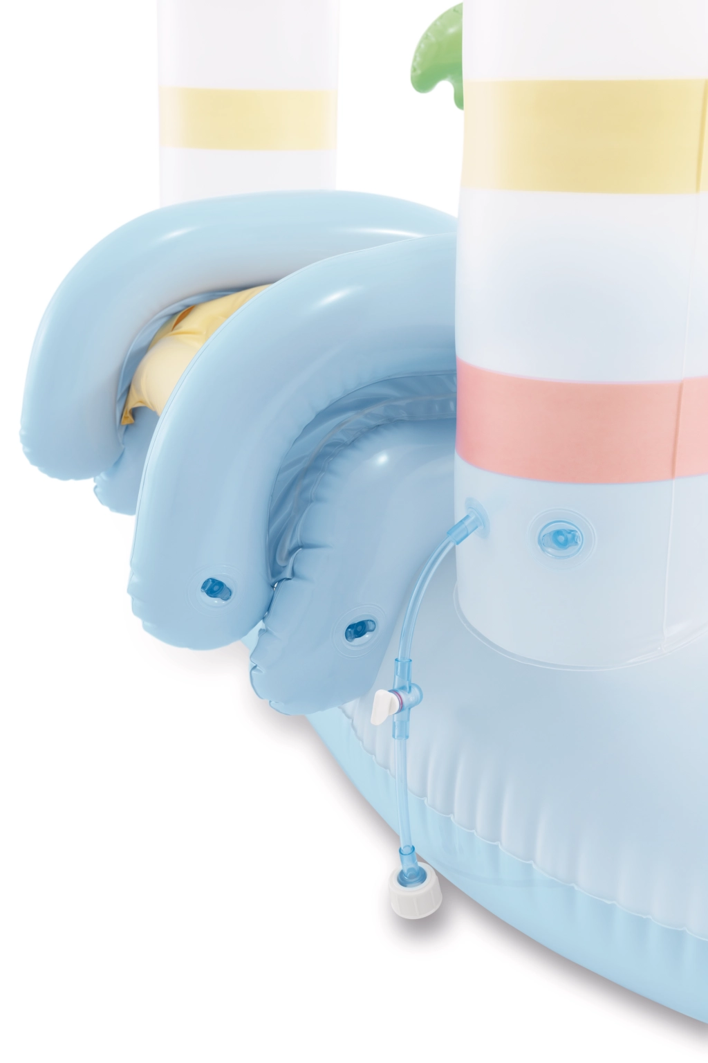 - bassin bleu clair, toboggan jaune, décorations colorées