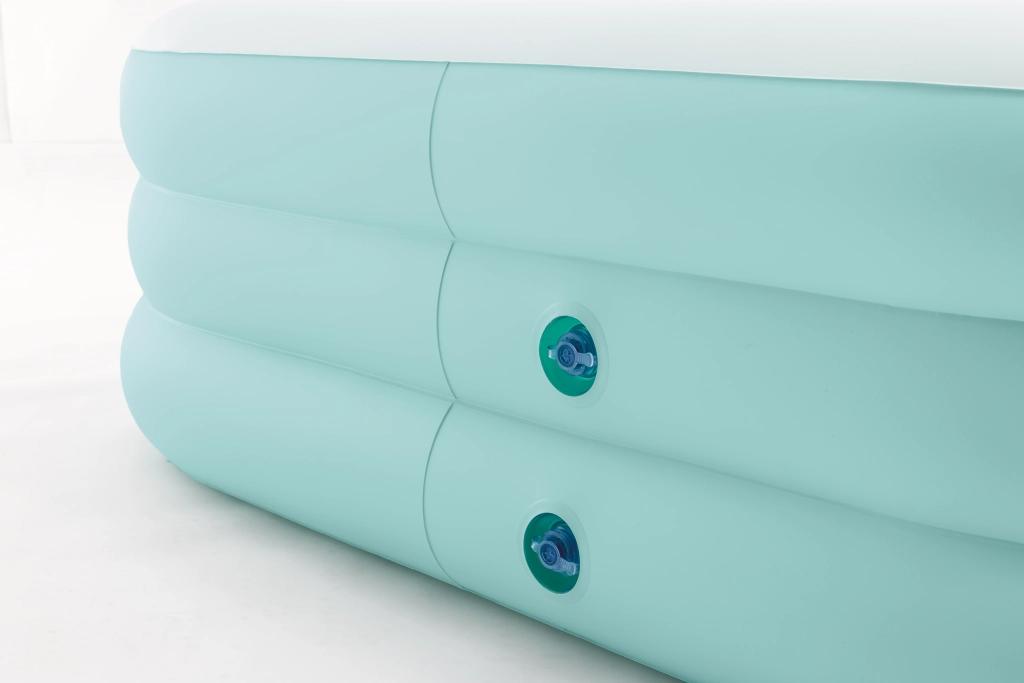 Un grand atout réside dans les sièges gonflables intégrés sur les deux côtés courts, qui séparent la zone de détente de l’espace de baignade. Le fond intérieur plat assure un appui sûr et agréable pour se tenir debout ou s’asseoir dans l’eau. Une valve de vidange pratique permet une évacuation rapide de l’eau et un entretien simple.