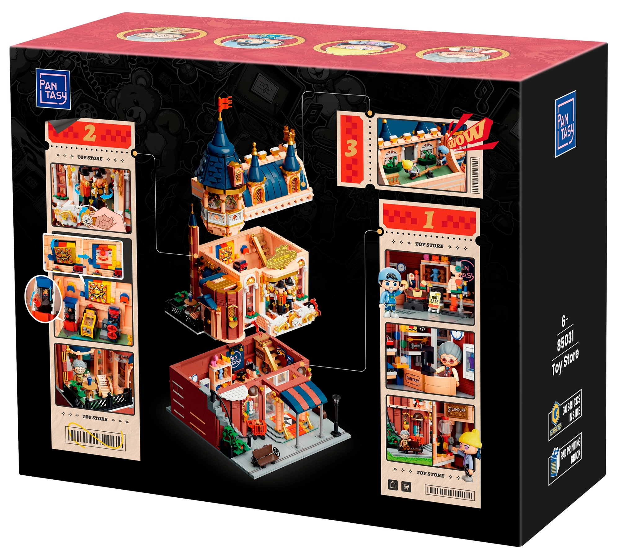 Le bâtiment se compose de trois étages facilement séparables : rez-de-chaussée – magasin de jouets avec modèles miniatures et expositions, 1er étage – salon de jeux rétro avec bornes d’arcade et jeux de société, et terrasse sur le toit avec pavillon pour se détendre. Quatre minifigurines animent des scènes du quotidien – vendeur, clients et enfants.