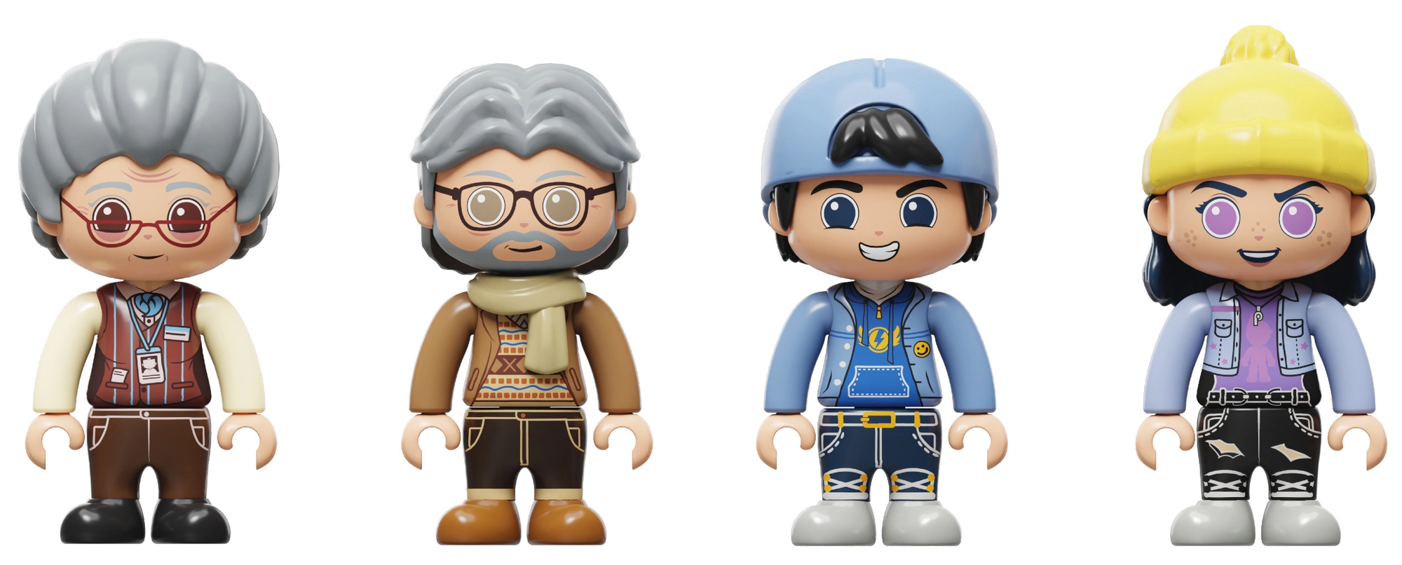 Le set comprend quatre personnages aux tenues marquantes et accessoires variés, donnant dynamisme et caractère aux scènes du magasin de jouets.