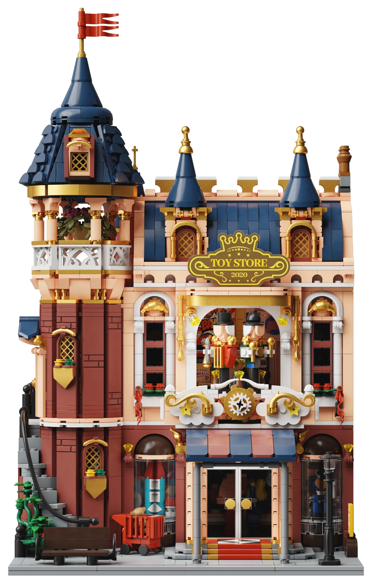Façade ornementale, portes tambour, vitrines et coins thématiques créent une atmosphère nostalgique d’un magasin de jouets classique.