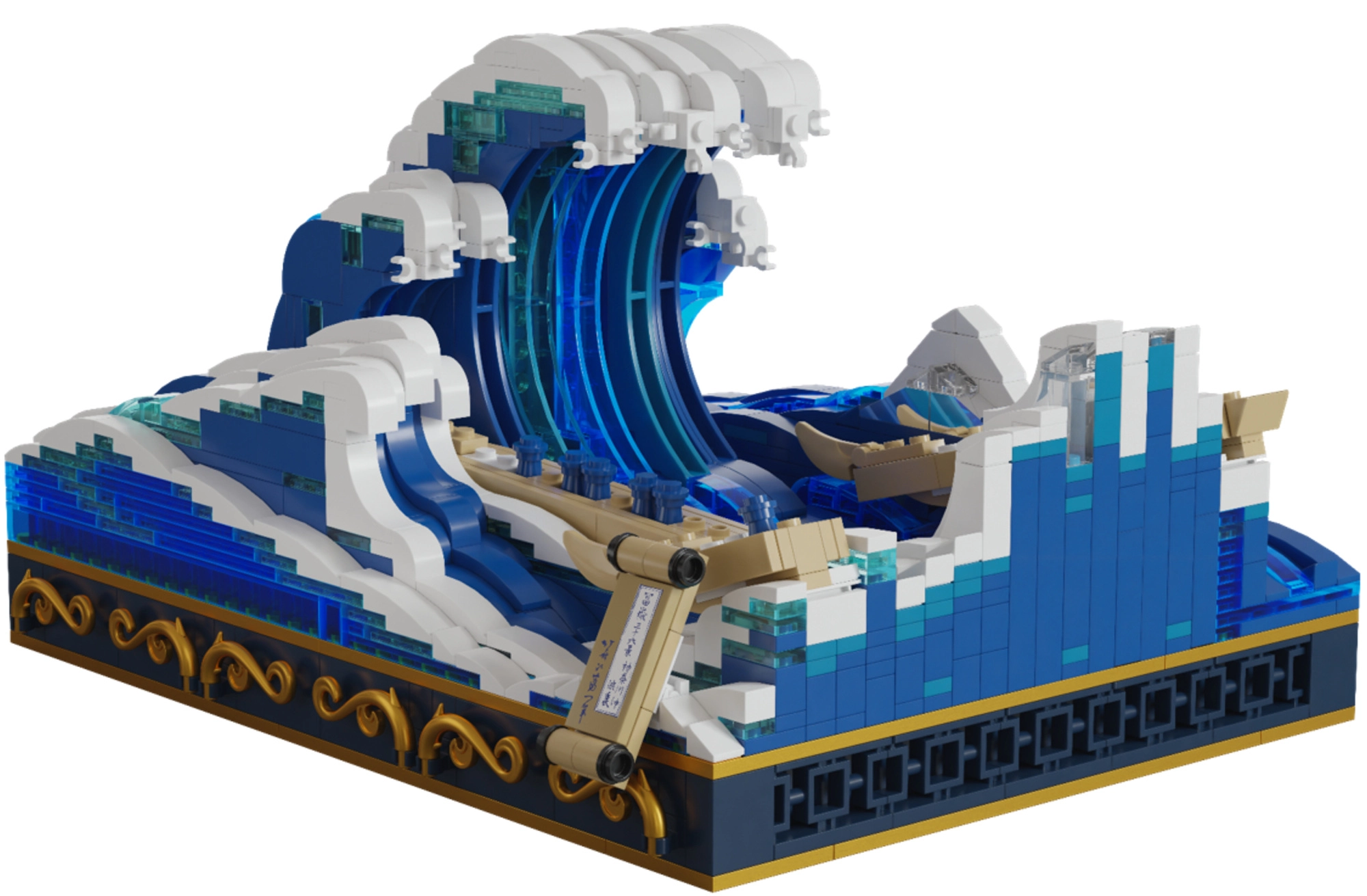 Recréez chez vous la scène célèbre avec les formes dynamiques des vagues, une embarcation et un socle décoratif. Le résultat est une pièce d’exposition impressionnante inspirée par HOKUSAI.