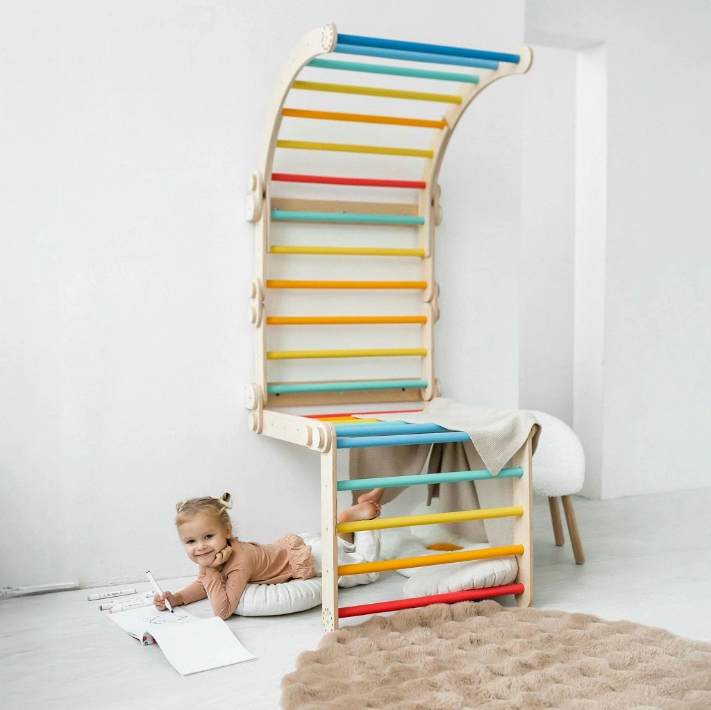 La barre et les barreaux arc-en-ciel encouragent les suspensions et l’escalade, tandis que les bords lisses et le cadre stable garantissent la sécurité à chaque activité.