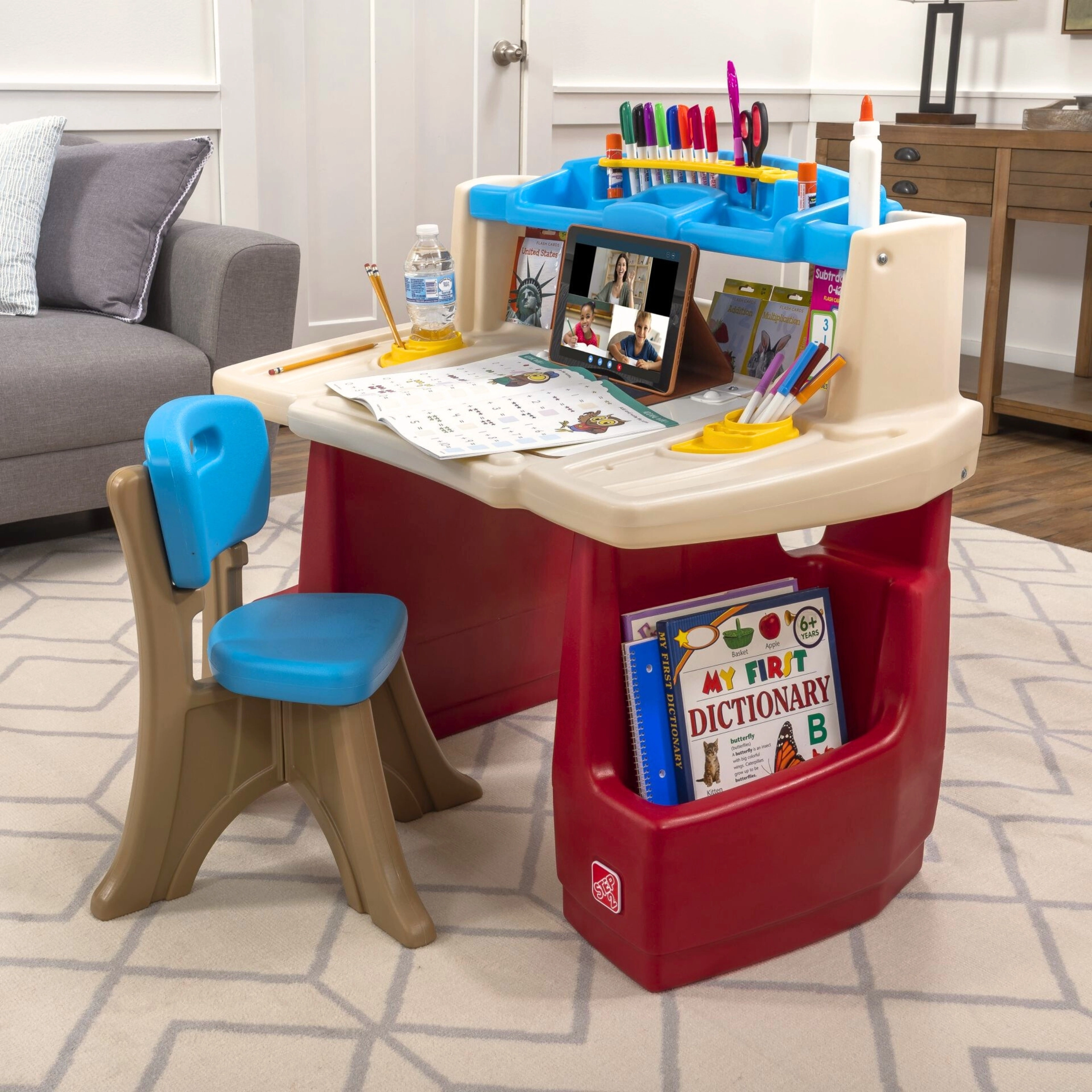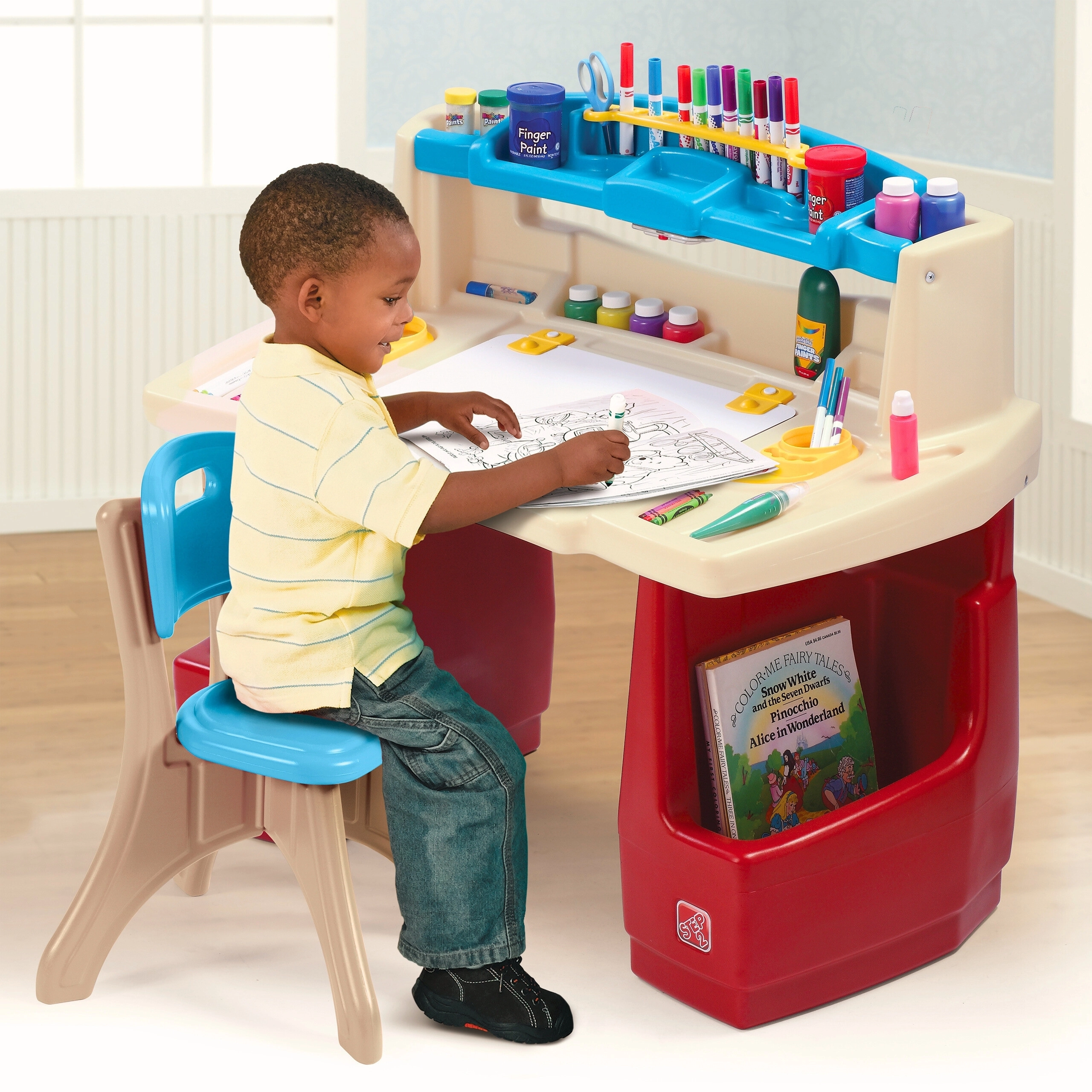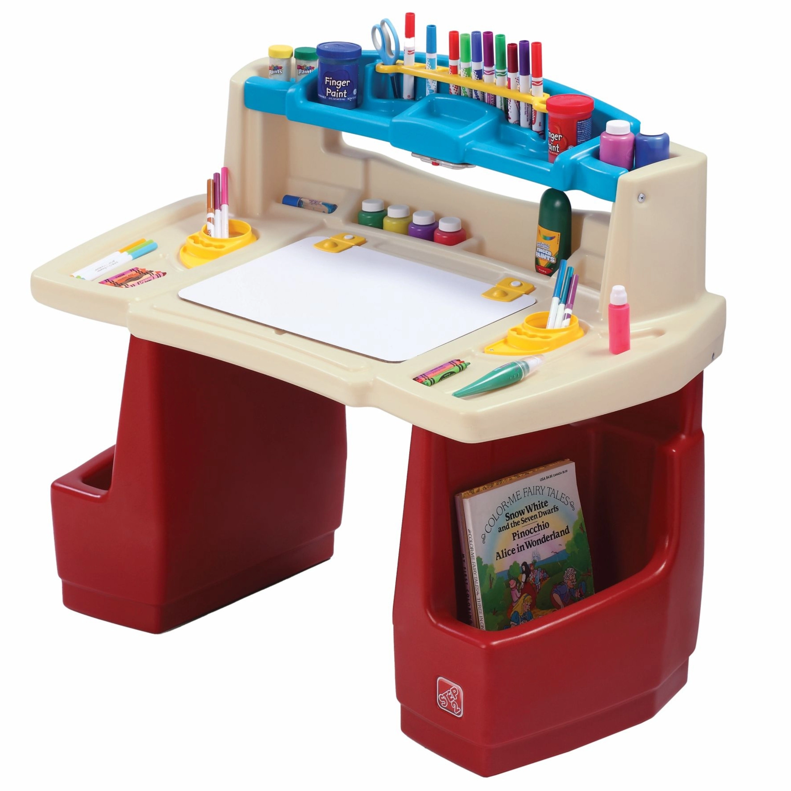Le set STEP2 Deluxe Art Master transforme la chambre des enfants en atelier inspirant. Les enfants disposent d’un grand espace de travail avec ardoise effaçable relevable, simple à nettoyer et dissimulant un espace supplémentaire pour les accessoires. L’organiseur supérieur, les paniers latéraux et les compartiments verticaux gardent crayons, peintures, livres et tablette toujours à portée de main.