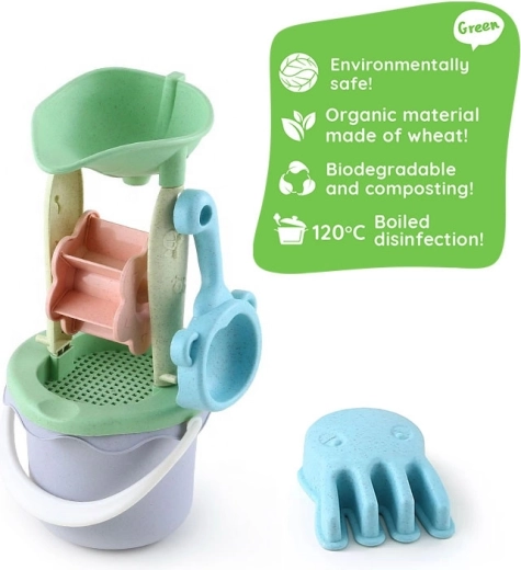 Le set de sable pour enfants Woopie Green apporte du plaisir dans le sable comme dans l’eau, dans une version écologique. Il comprend 9 pièces dont un seau, un moulin avec tamis, un arrosoir, des moules, une pelle et un râteau. Le tout est fabriqué en matériau organique et biodégradable au design pastel. Les éléments possèdent des poignées confortables et sont sans danger pour les enfants – désinfectés à 120 °C. Idéal pour le bac à sable, la plage et le jardin.