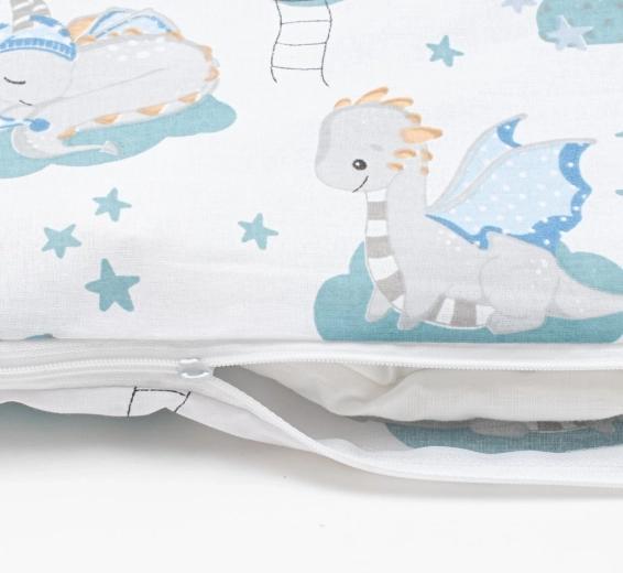 Parure de lit pour berceau en 100 % coton toute douce avec un adorable motif de petit dragon. L’ensemble 2 pièces comprend une housse de couette 120 × 90 cm et une taie d’oreiller 40 × 60 cm. Pratiques, les fermetures zippées sécurisées sans tirette pendante, impression couleurs stables et matière respectueuse des peaux sensibles des enfants. Certification OEKO-TEX STANDARD 100.