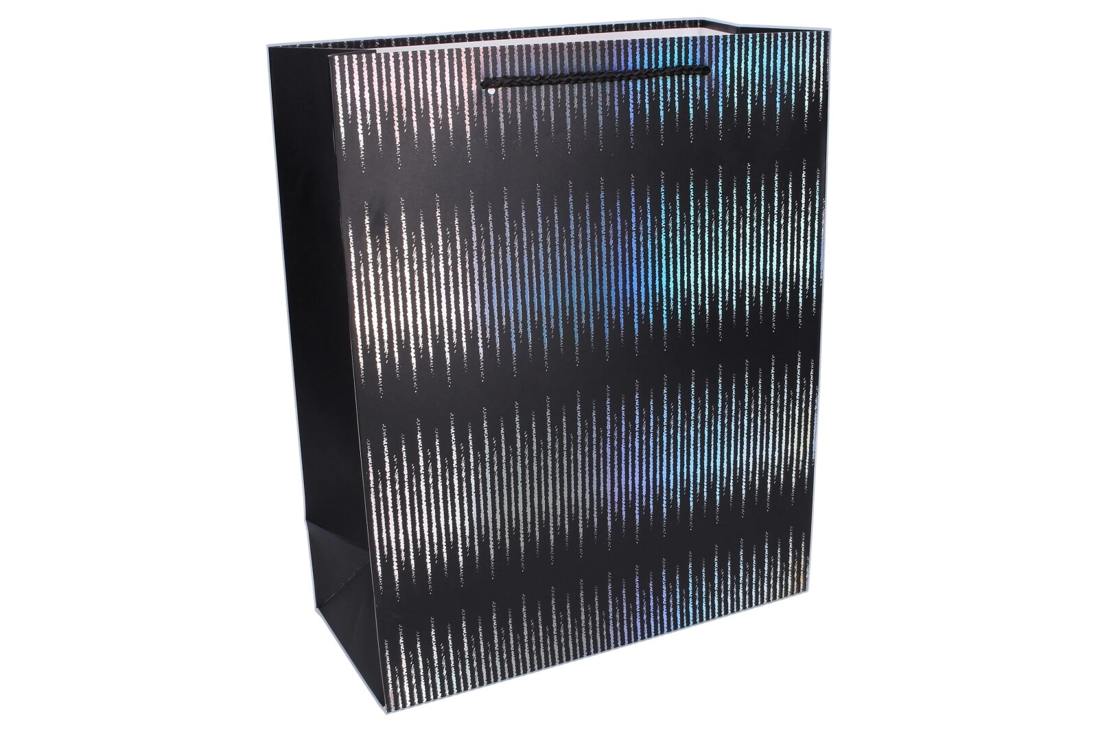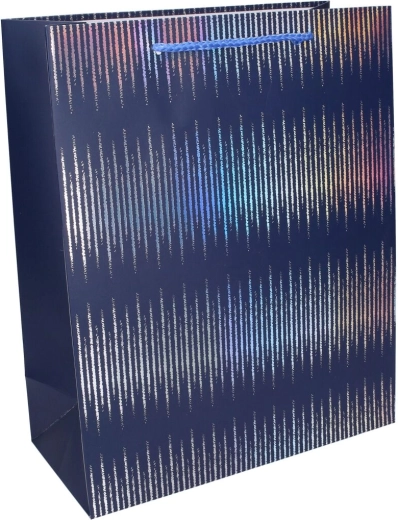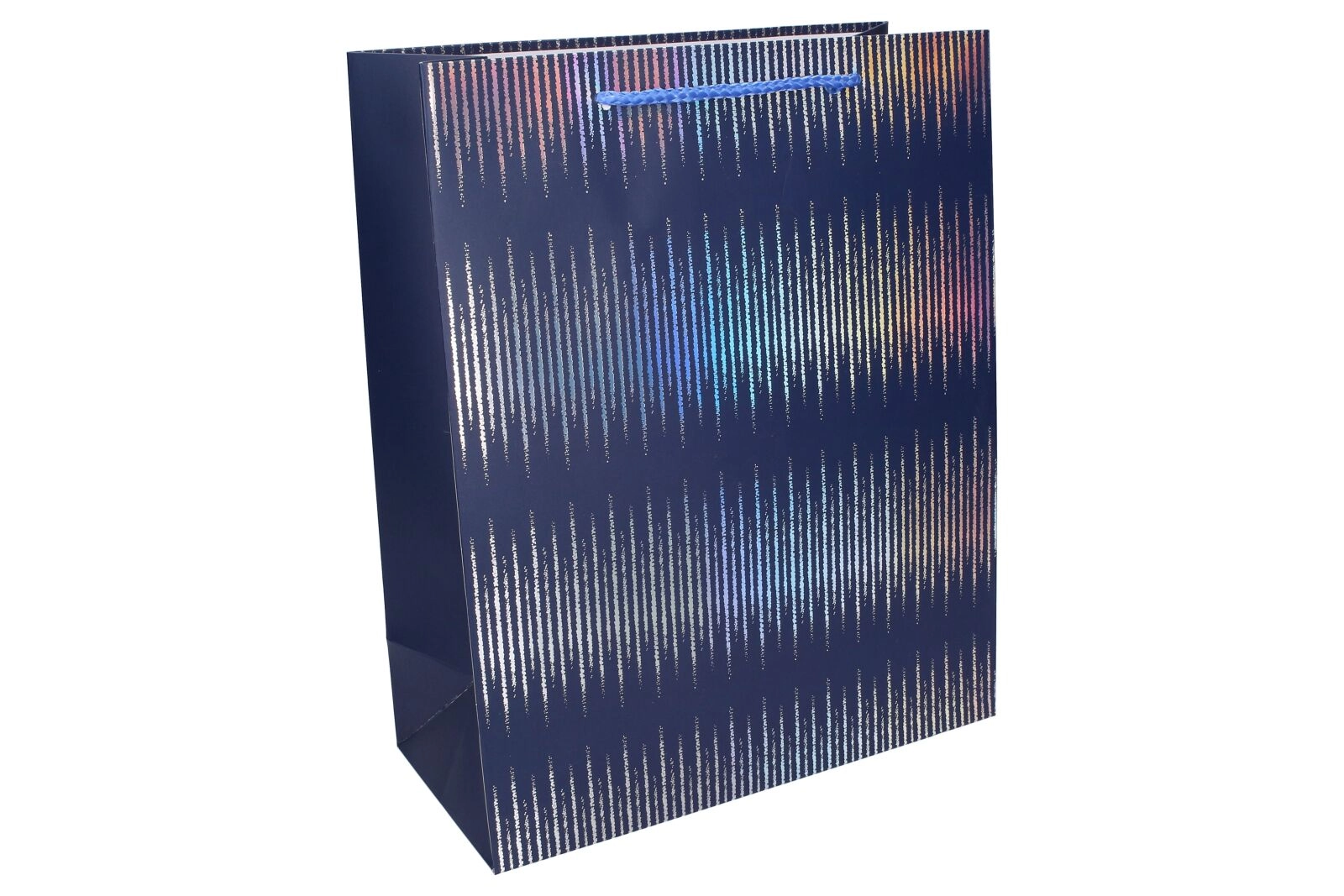 Élégant sac cadeau taille L (30 × 40 × 12 cm) pour une remise de cadeau stylée. Offre une construction robuste, un design holographique brillant et une anse en corde confortable en bleu, noir, rouge et blanc.
