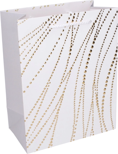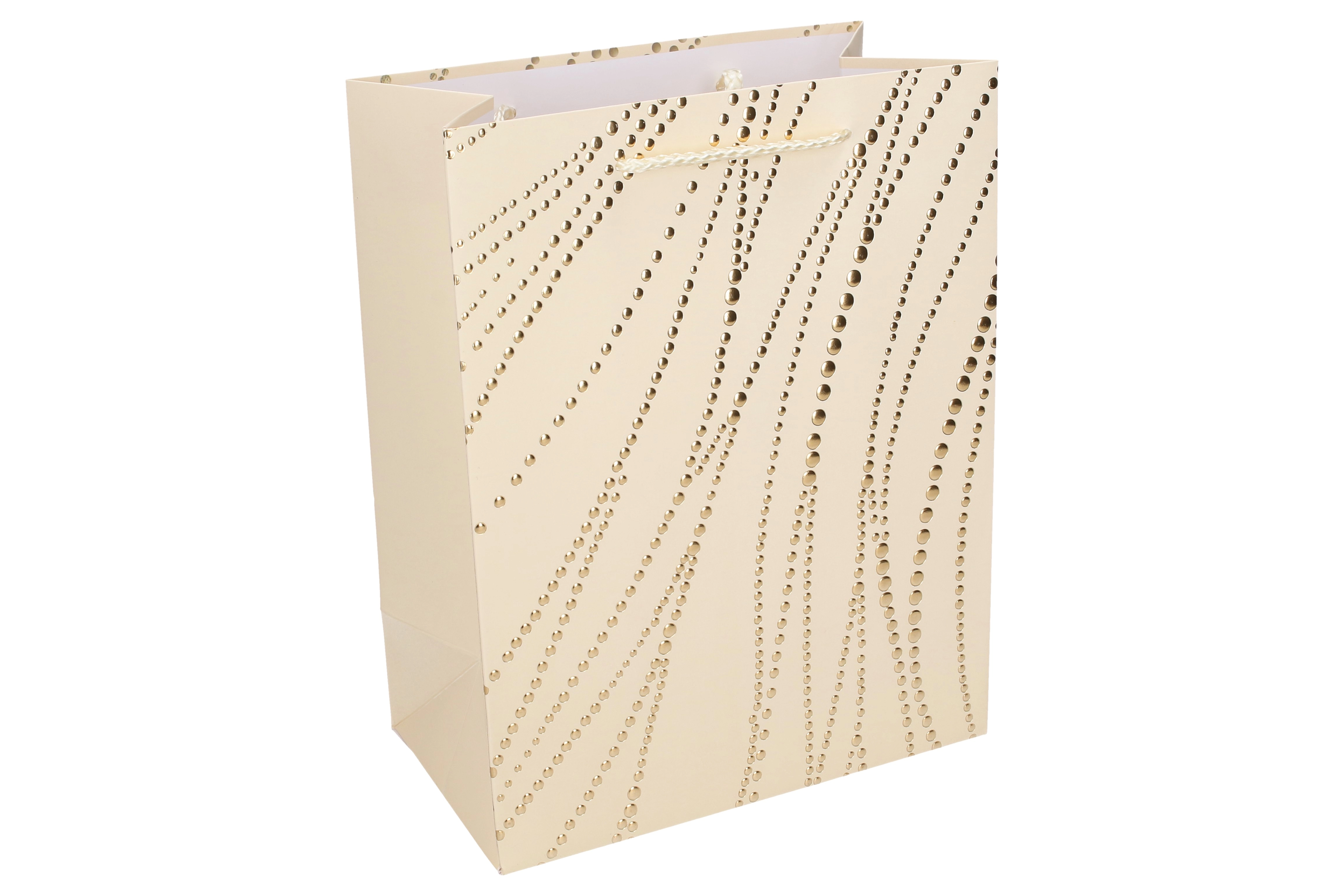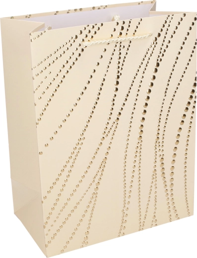Ce sac cadeau taille L, utilisable toute l’année, est idéal pour les anniversaires, mariages, anniversaires de mariage et cadeaux d’entreprise. La surface brillante avec un délicat motif de points dorés ondulés paraît luxueuse et moderne, tandis que les cordelettes robustes assurent un transport confortable et sûr.