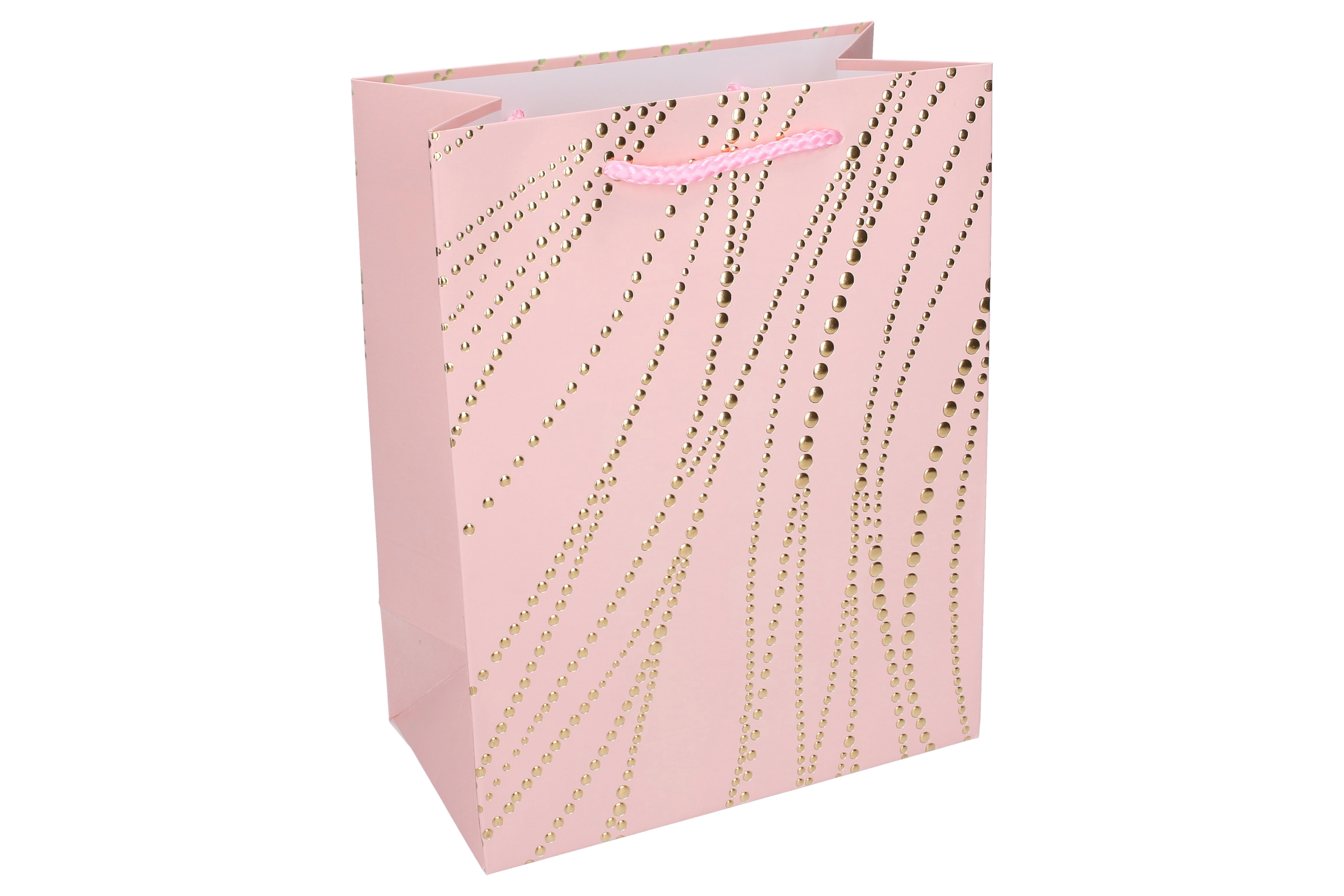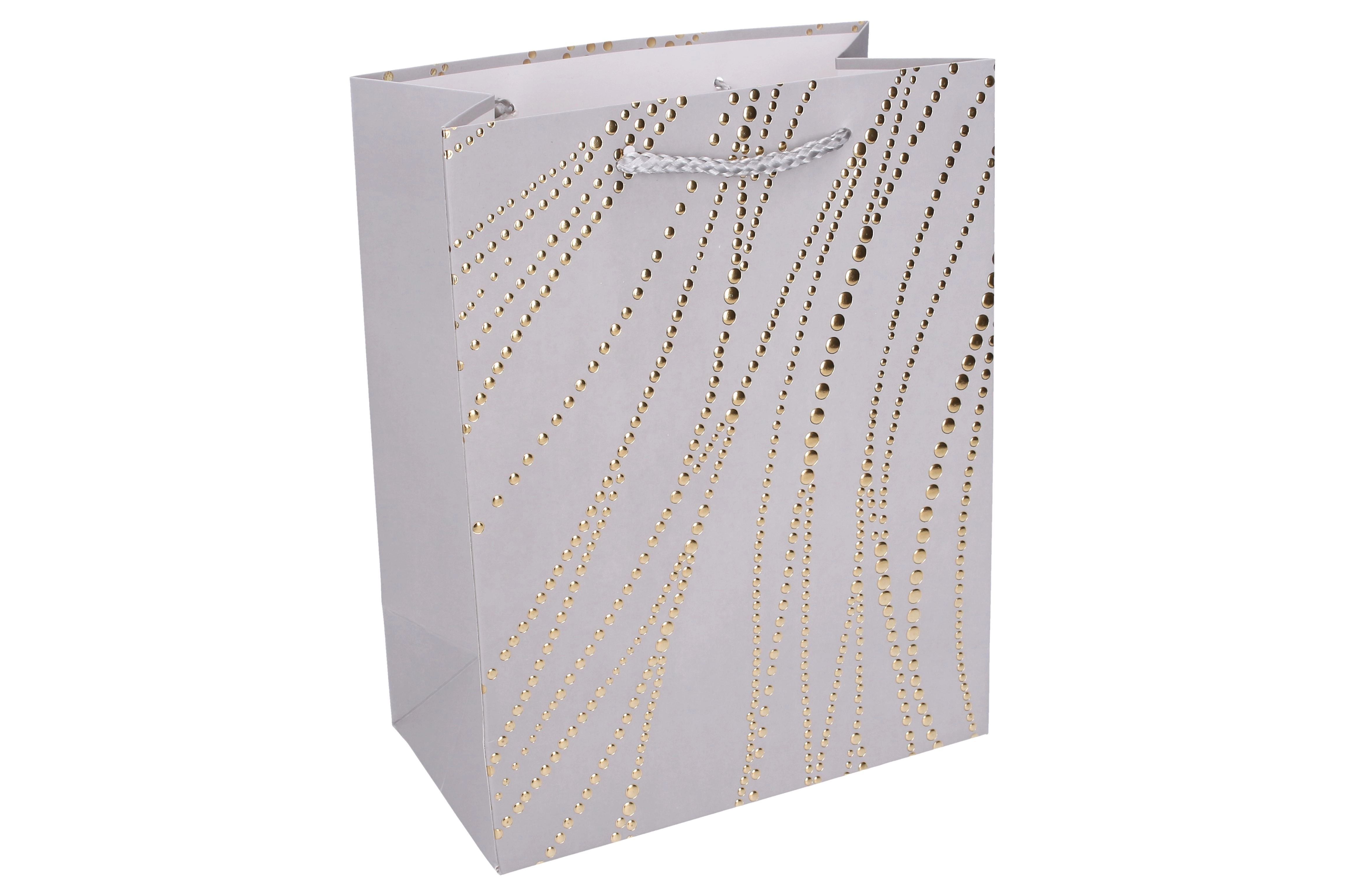 Sac cadeau stylé en taille L (30 × 40 × 12 cm) pour toutes les occasions. Il offre une poignée en corde solide, une finition brillante avec décor métallique et des soufflets latéraux pour plus de volume. Disponible en 4 couleurs – rose, or, gris et blanc – pour un emballage cadeau représentatif et élégant sans effort.
