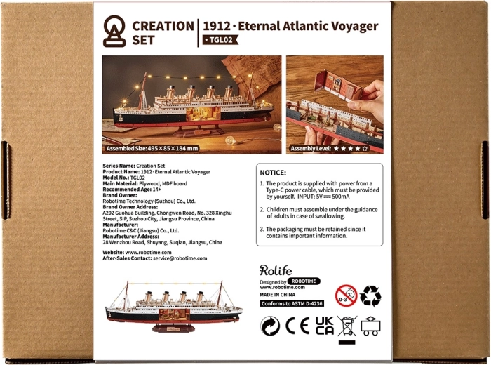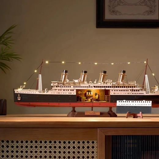 Ce kit DIY design propose un modèle réaliste d’un paquebot légendaire avec des proportions exactes, quatre cheminées et des ponts richement détaillés. Grâce au panneau latéral amovible, vous pouvez observer les cabines et les couloirs, tandis que le léger chaud des LED met en valeur les détails intérieurs et extérieurs. Une fois terminé, le modèle devient une décoration élégante pour le salon, le bureau ou la chambre d’étudiant.