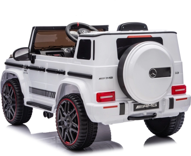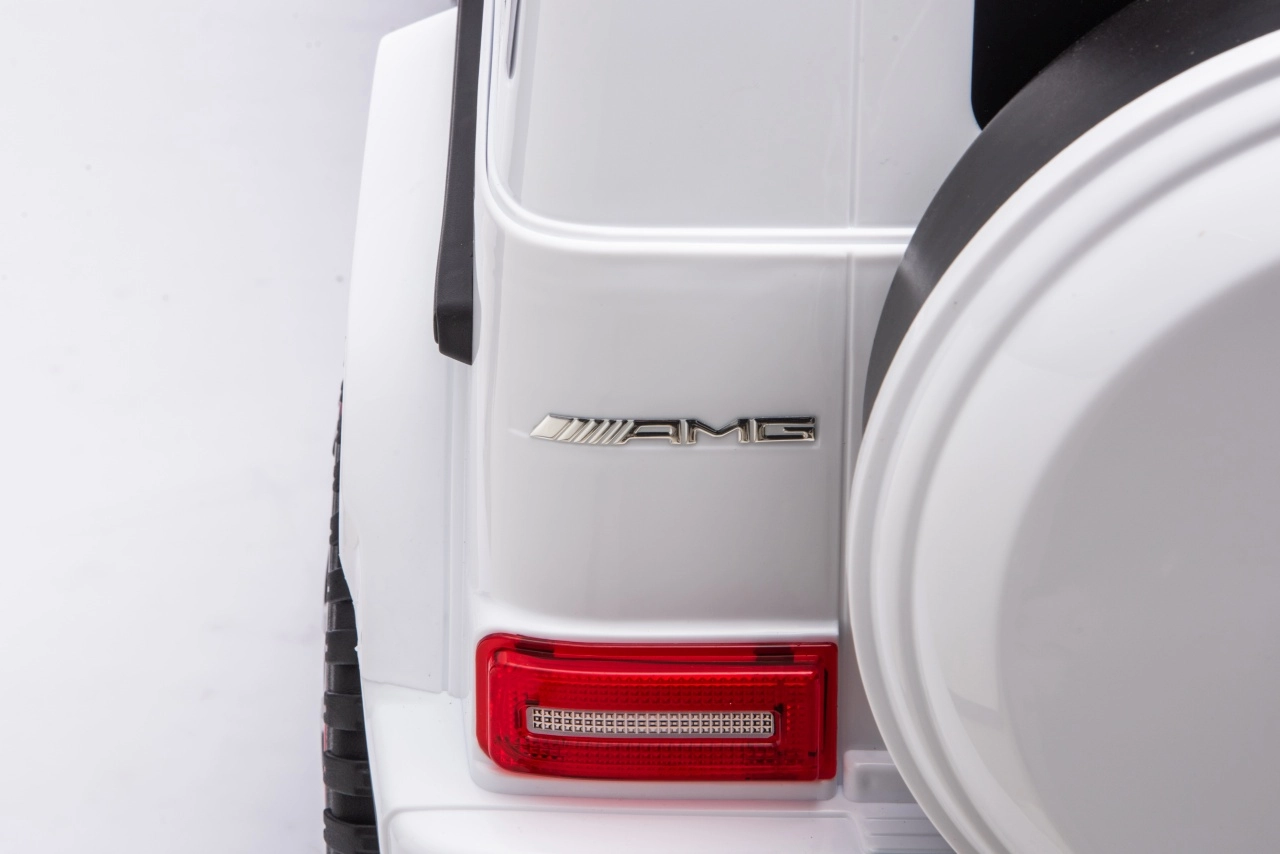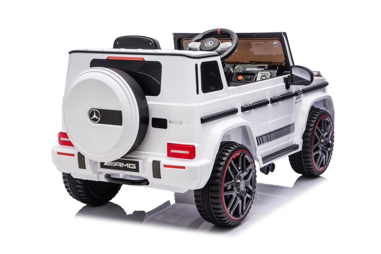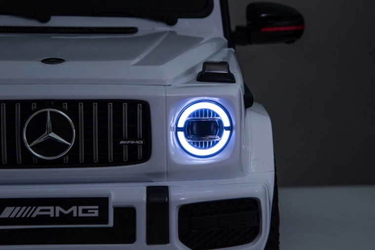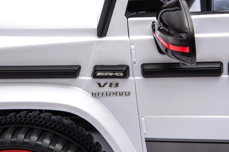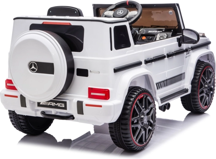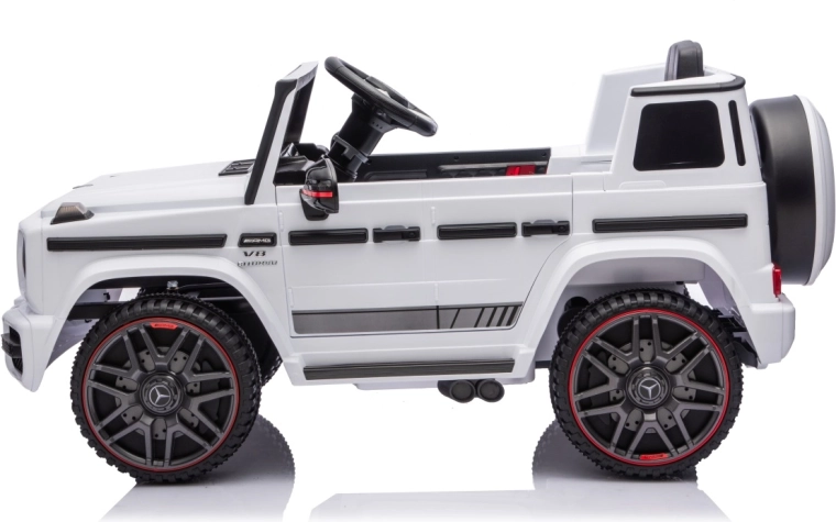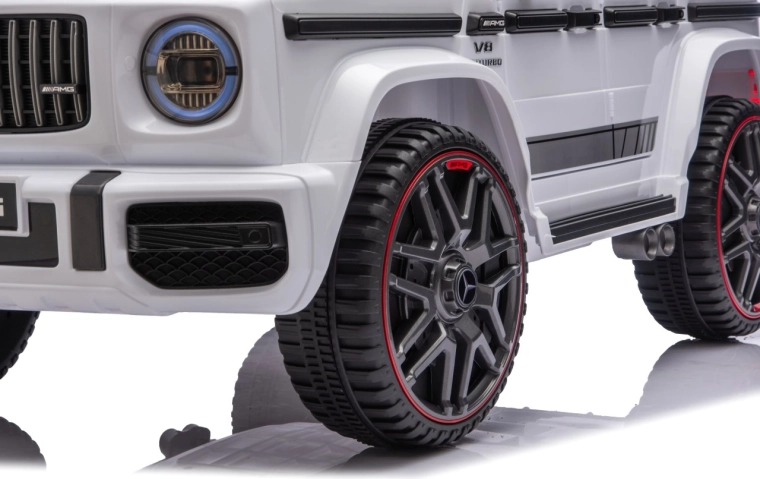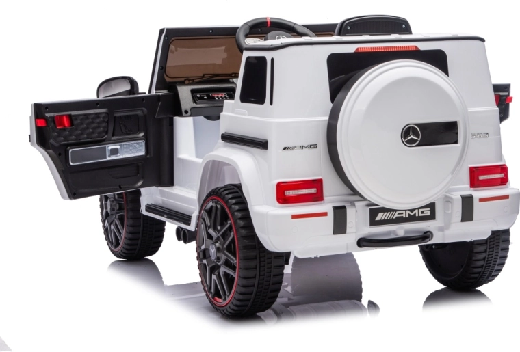 Petit conducteur, grandes aventures. La voiture électrique Mercedes‑AMG G63 séduit par l’apparence authentique de l’iconique Classe G – de la calandre distinctive et des projecteurs aux jantes sport avec accents rouges et au cache‑roue de secours. Démarrage en douceur, marche avant/arrière et cockpit clair à commandes faciles rendent chaque balade agréable.