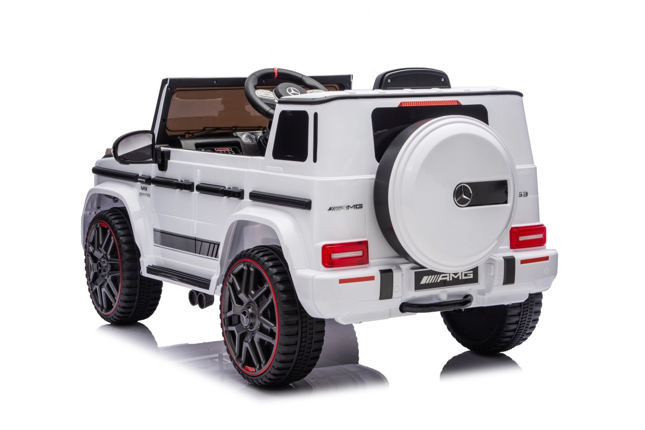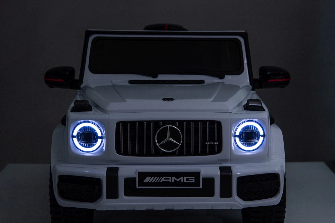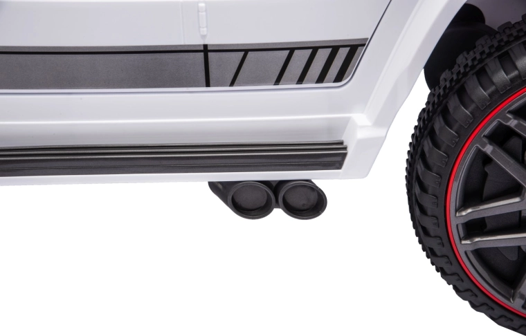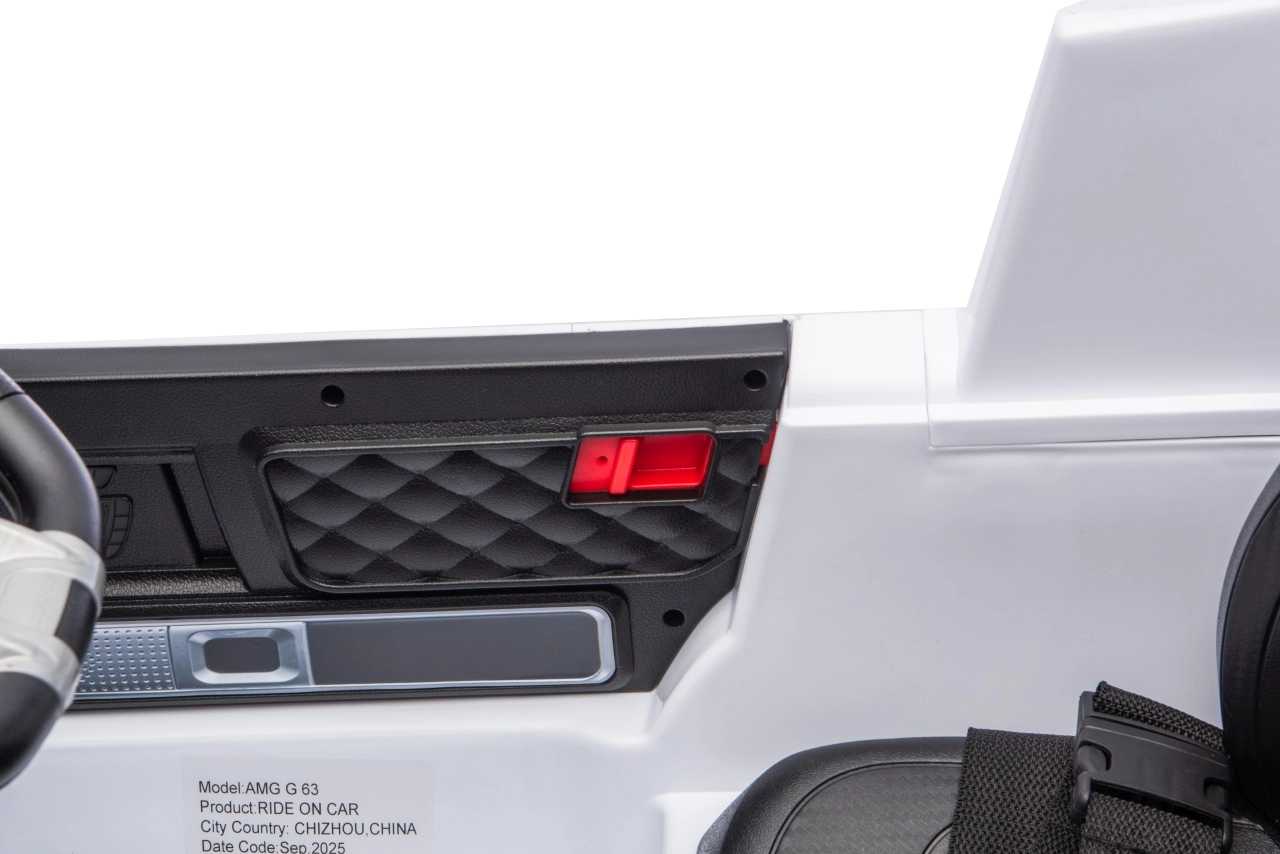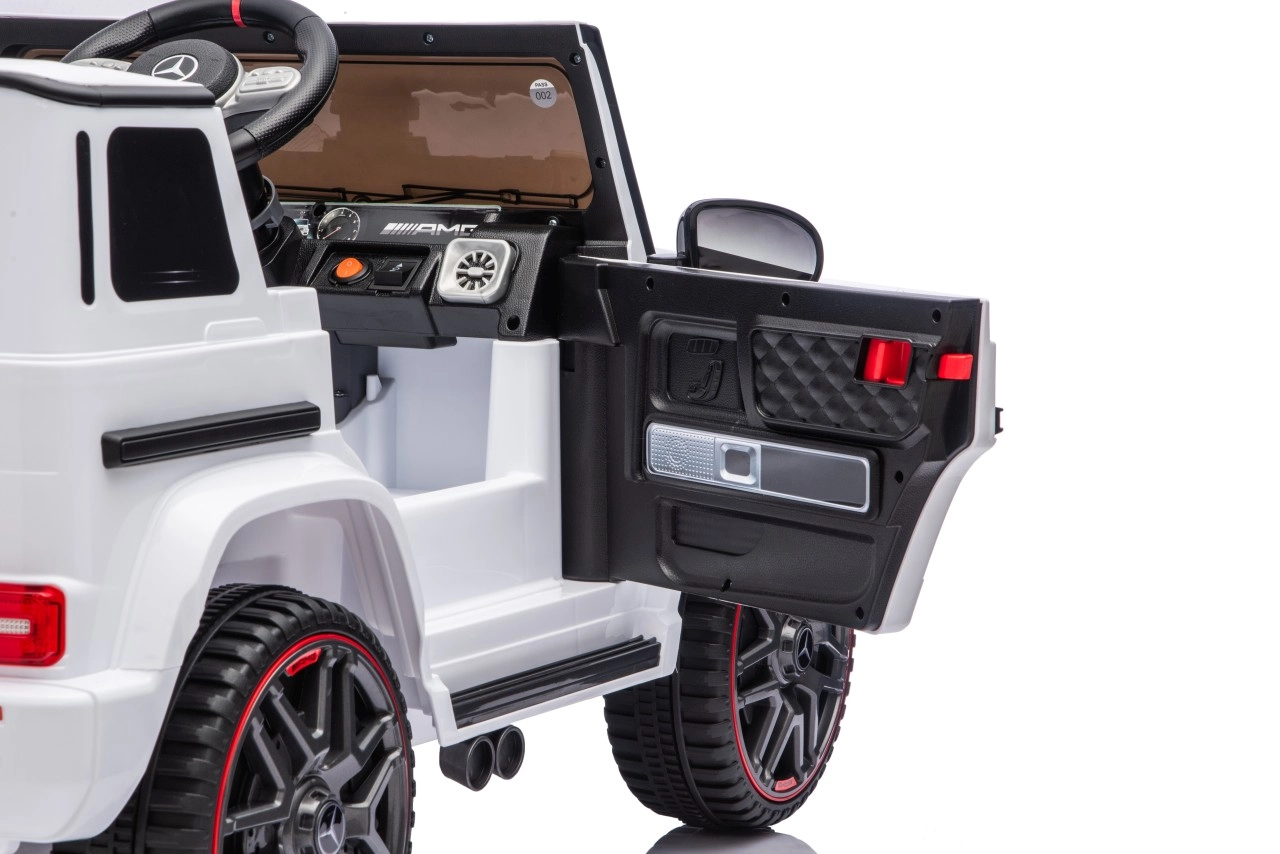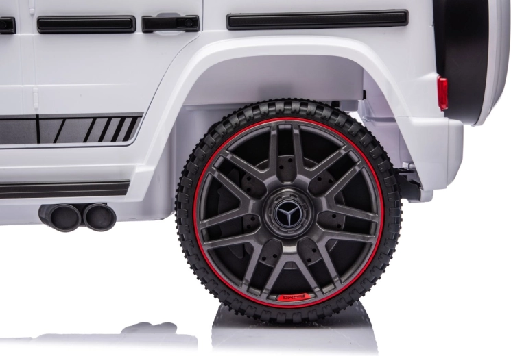 Petit conducteur, grandes aventures. La voiture électrique Mercedes‑AMG G63 séduit par l’apparence authentique de l’iconique Classe G – de la calandre distinctive et des projecteurs aux jantes sport avec accents rouges et au cache‑roue de secours. Démarrage en douceur, marche avant/arrière et cockpit clair à commandes faciles rendent chaque balade agréable.