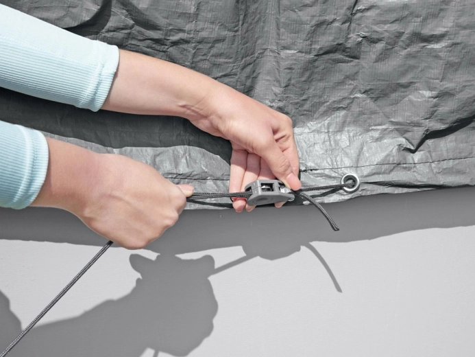Grâce au revêtement Polar‑Shield, la bâche convient à une utilisation toute l’année et conserve ses propriétés même par temps froid jusqu’à −25 °C. Le mécanisme de serrage coupe-vent maintient fermement la bâche en place et réduit au minimum le risque de soulèvement par le vent.