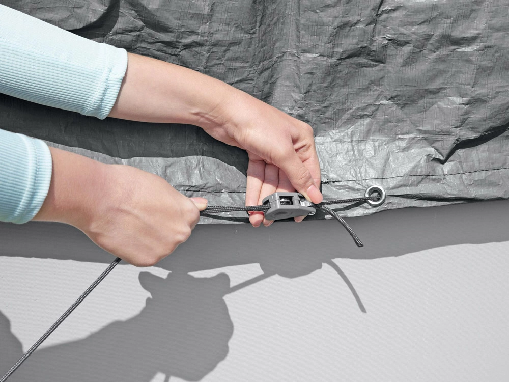 Le mécanisme de serrage intégré avec butée fixe la bâche autour du rebord de la piscine pour un maintien sûr et stable.