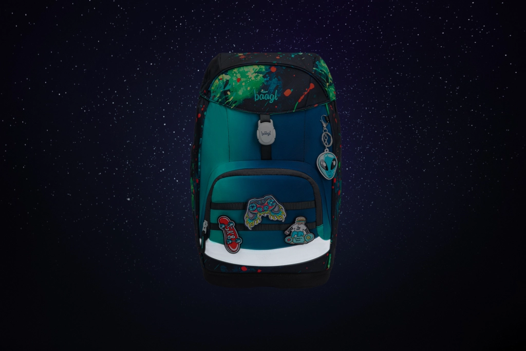 L’équipement pratique comprend un compartiment principal avec organiseur, des plaques plastiques légères pour protéger les cahiers, une poche frontale isotherme pour le goûter et un rabat supérieur à fermeture magnétique qui se clipse automatiquement. La matière est recyclée et imperméable avec la certification GRS et des éléments réfléchissants. Le design ludique peut être personnalisé avec des badges interchangeables Baaglies. L’ensemble inclut une trousse simple étage avec fermeture éclair YKK de qualité, élastiques pour les fournitures et fenêtre pour l’emploi du temps, ainsi qu’un sac multifonction avec poche frontale zippée pour les chaussures ou l’équipement de sport.