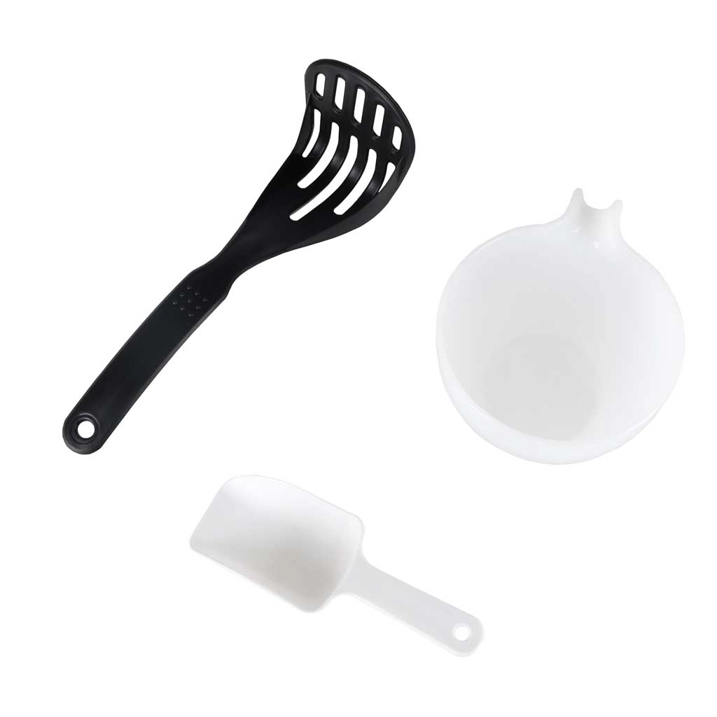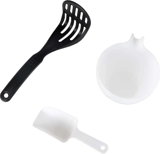 récipient avec robinet et poignée, couvercle, plateau égouttoir, gobelet pour l’extrait (17 × 7 cm), cuillère (15 × 5,5 cm), pilon (22 × 7,5 cm)