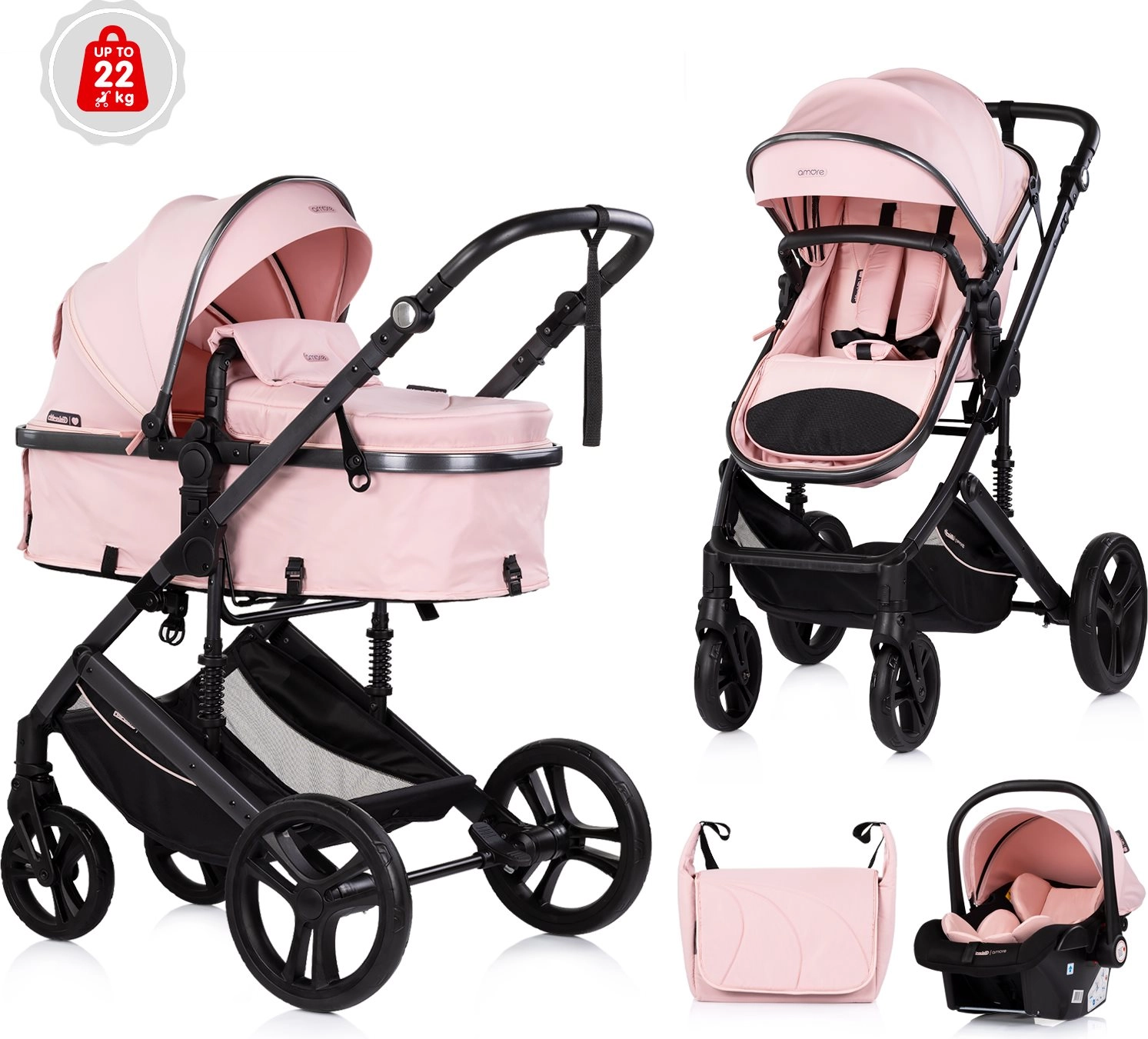 La poussette combinée stylée CHIPOLINO AMORE 2-en-1 en teinte Powder Pink offre landau et siège sport en un seul produit. Grâce à sa structure légère, à son châssis suspendu et à ses grandes roues, elle maîtrise la ville comme les terrains plus exigeants. Le confort et la sécurité sont assurés par un harnais 5 points, un dossier réglable sur 3 positions, une assise réversible et une capote spacieuse avec visière pare-soleil. Conforme aux normes EN1888-1 et EN1888-2.