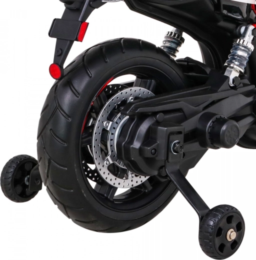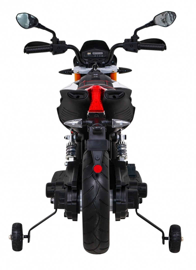 Le panneau multimédia avec MP3, SD, AUX et USB permet d’écouter la musique préférée. Des éléments pratiques tels que la clé de démarrage, l’indicateur de charge, les feux LED avant et arrière ou la béquille pliable facilitent l’usage quotidien. Pour une plus grande stabilité, des roulettes d’appoint sont également incluses. La charge maximale est de 30 kg, la moto accompagnera donc l’enfant dans sa croissance.