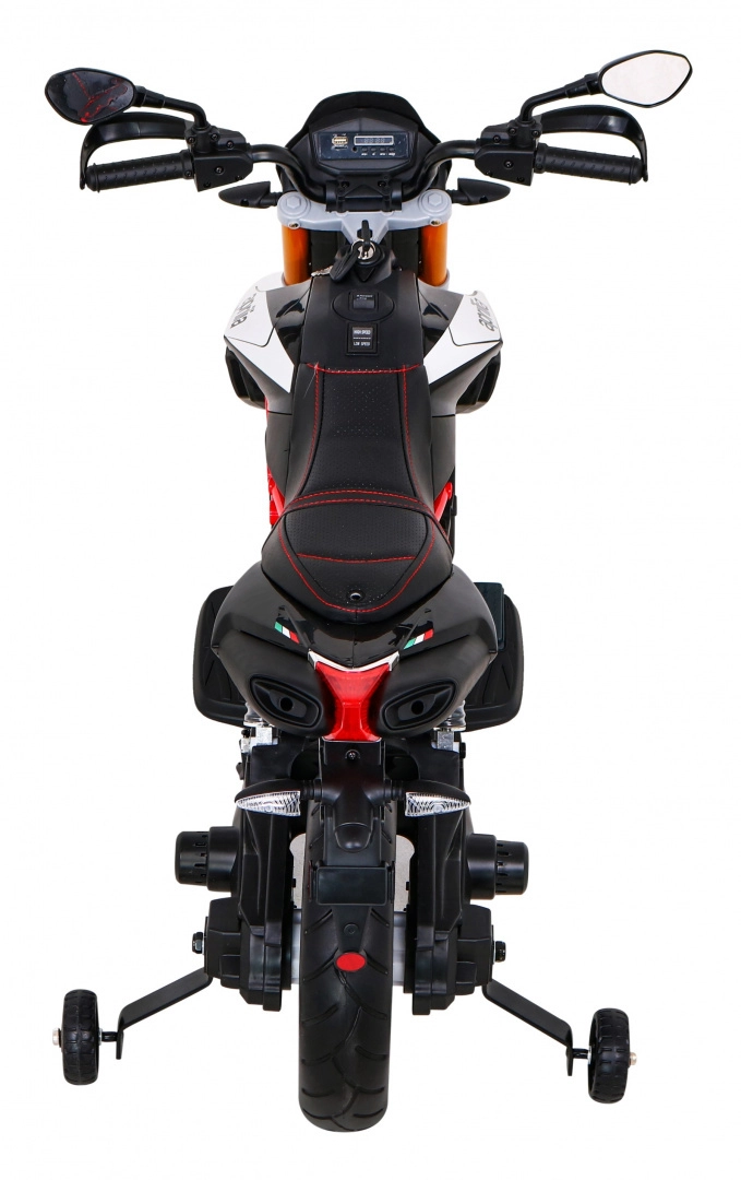 La moto électrique pour enfants au style affirmé APRILIA en noir ravira les petits pilotes grâce à sa puissance 2×12 V / 25 W, ses roues EVA confortables et son démarrage en douceur. Elle offre deux vitesses, la conduite avant/arrière, des feux avant et arrière et un riche équipement multimédia MP3/SD/AUX/USB. Le confort est complété par une selle en similicuir noir, une suspension arrière et un indicateur d’état de la batterie.