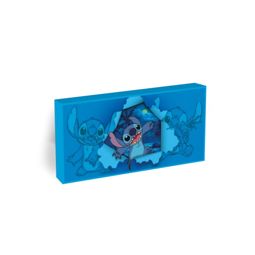 Insufflez au décor de la gaieté et de la lumière. Ce tableau décoratif à l’effigie de Lilo & Stitch séduit par son effet 3D réaliste de Stitch qui « perce » la surface, ajoutant de la profondeur au motif. La dominante bleue associée à un doux éclairage nocturne crée une ambiance chaleureuse dans une chambre d’enfant ou un coin jeux.
