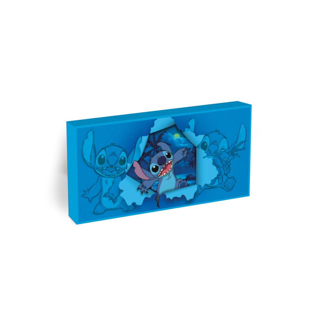 Grâce à sa construction légère et robuste, le tableau se suspend facilement au mur ou se pose sur une étagère. Idéal comme veilleuse, décoration de collection ou cadeau original pour les amoureux de Lilo & Stitch.