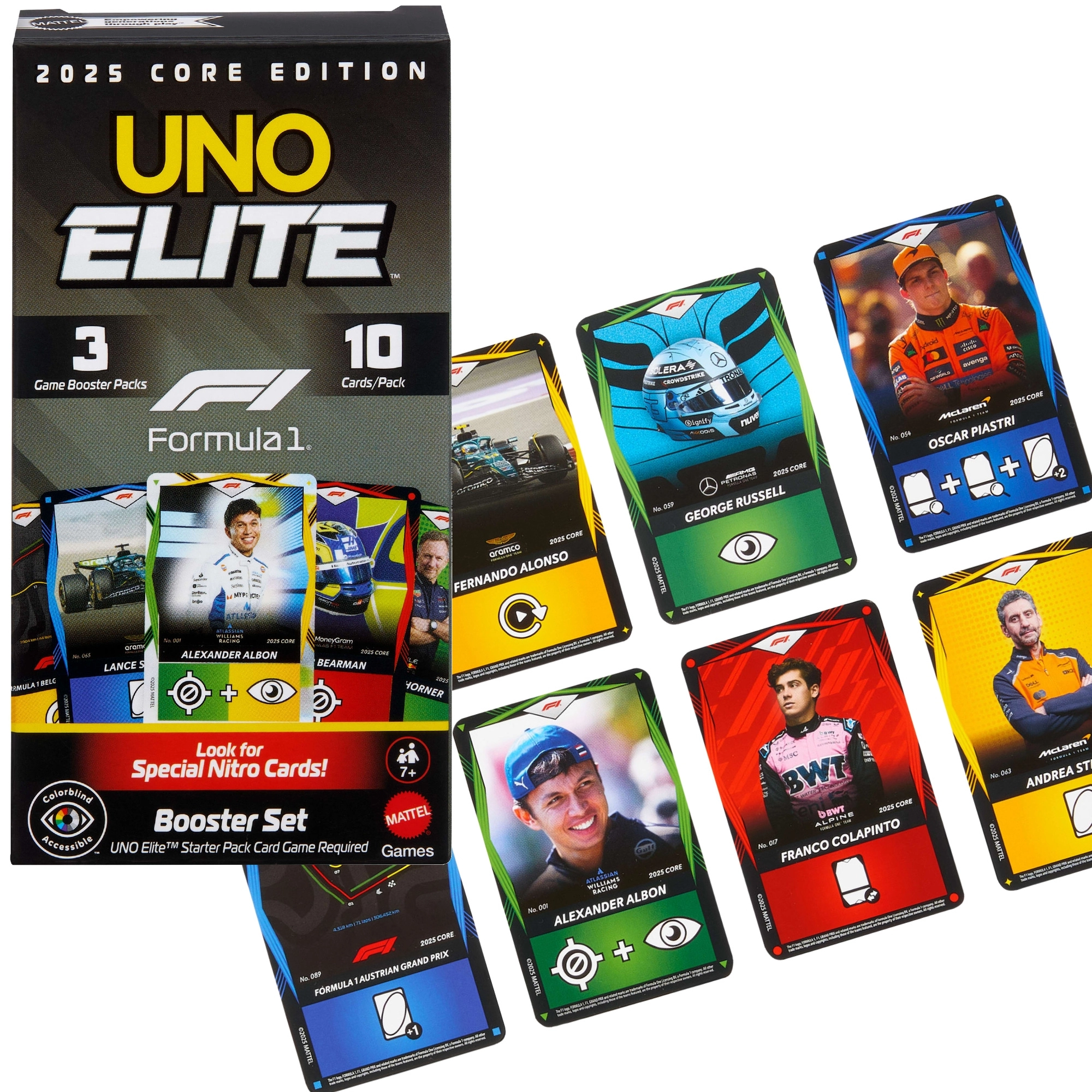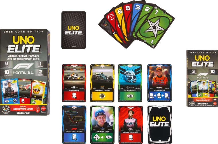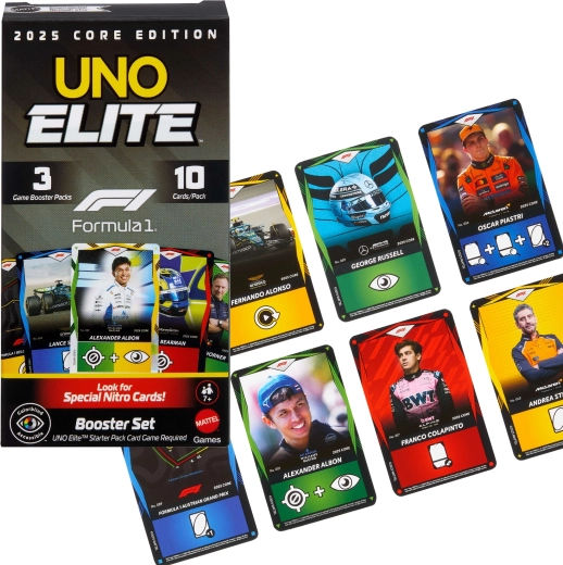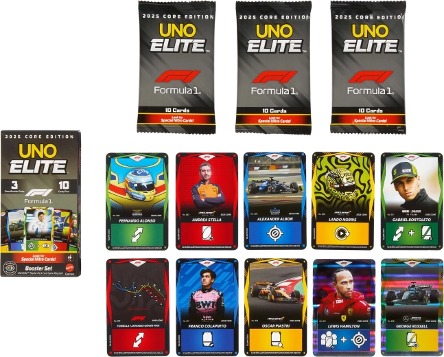 Plongez dans le rythme effréné des courses avec l’extension UNO Elite Formula 1 2025. Chaque Booster Pack apporte des cartes sélectionnées aléatoirement avec des thèmes de pilotes de F1, de monoplaces, de casques et de circuits. Les cartes Elite spéciales activent leurs capacités lorsqu’une carte avec l’icône Elite de la même couleur est jouée, vous offrant ainsi de nouvelles stratégies et des moments palpitants à chaque partie.