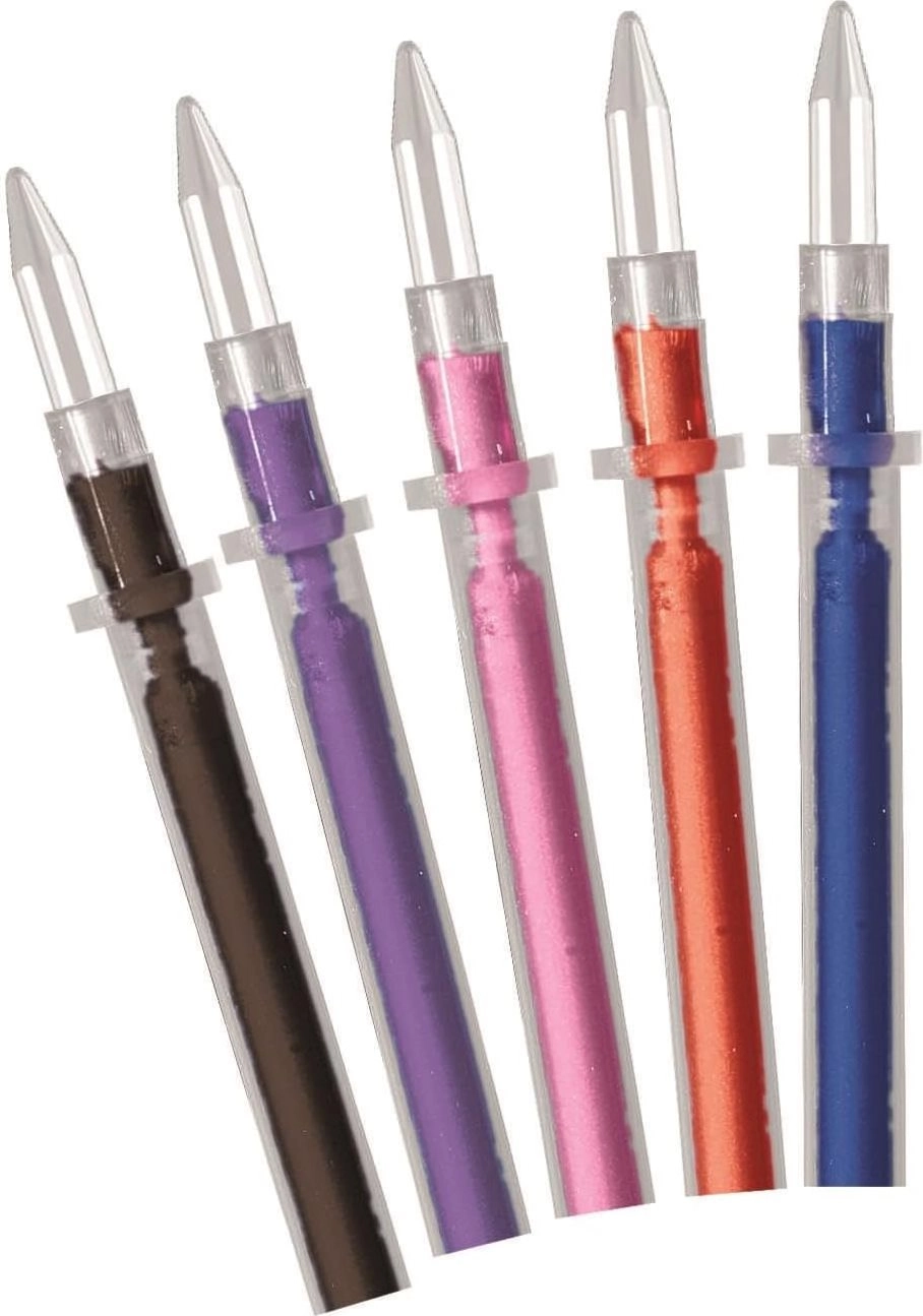 - 5 stylos personnalisables : corps transparents, recharges d’encre, capuchons et embouts.