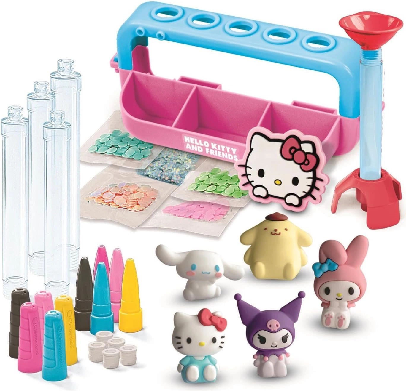 Transformez la création en une expérience magique avec un kit qui permet aux enfants de réaliser cinq stylos originaux. Les corps transparents des stylos-bille peuvent être remplis de paillettes, confettis et perles, décorés avec des autocollants et surmontés de figurines en gomme HELLO KITTY et ses amis. Le tout est rangé de manière claire dans un présentoir-organiseur pratique.