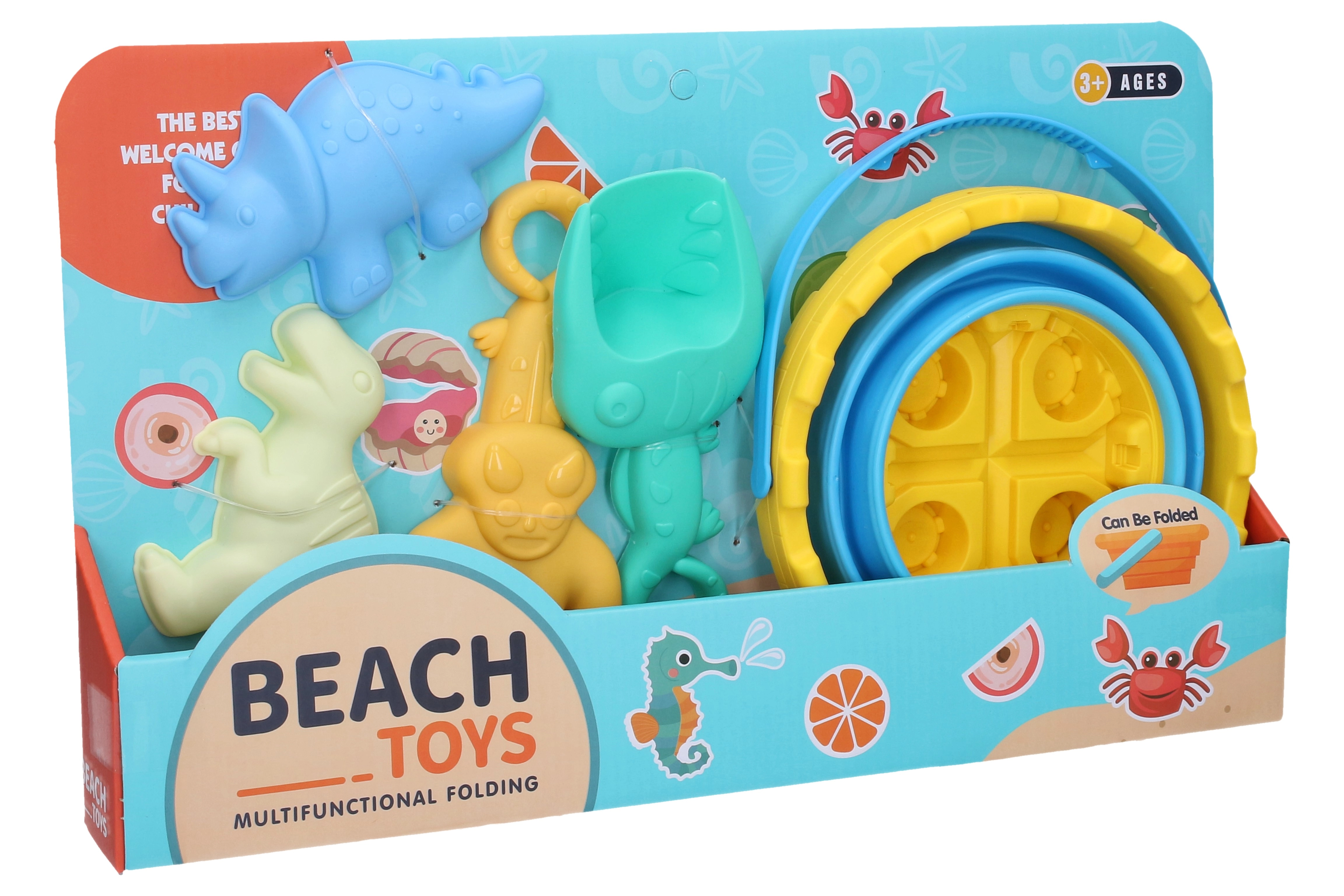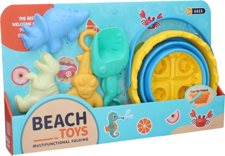 Amusant set de sable pour enfants sur le thème des dinosaures, comprenant un seau pliable, une pelle, un râteau et deux moules. Parfait pour la plage et l’aire de jeux – léger, résistant et facile à nettoyer. Développe la motricité, stimule la créativité et offre un divertissement sans fin en plein air.