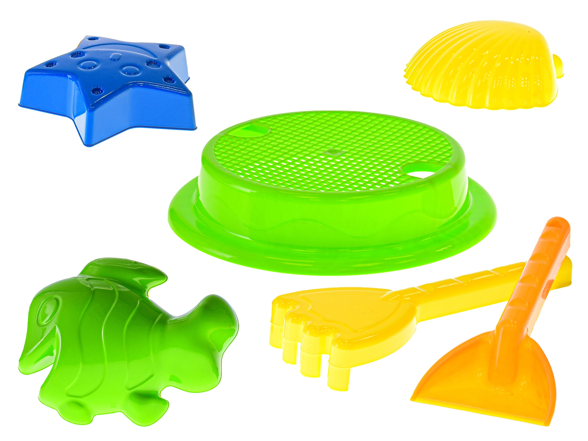 Le coffret comprend un tamis pour tamiser le sable, une pelle et un râteau pour creuser et façonner, ainsi que 3 moules (poisson, tortue, coquillage ou étoile de mer) pour de belles créations en sable.