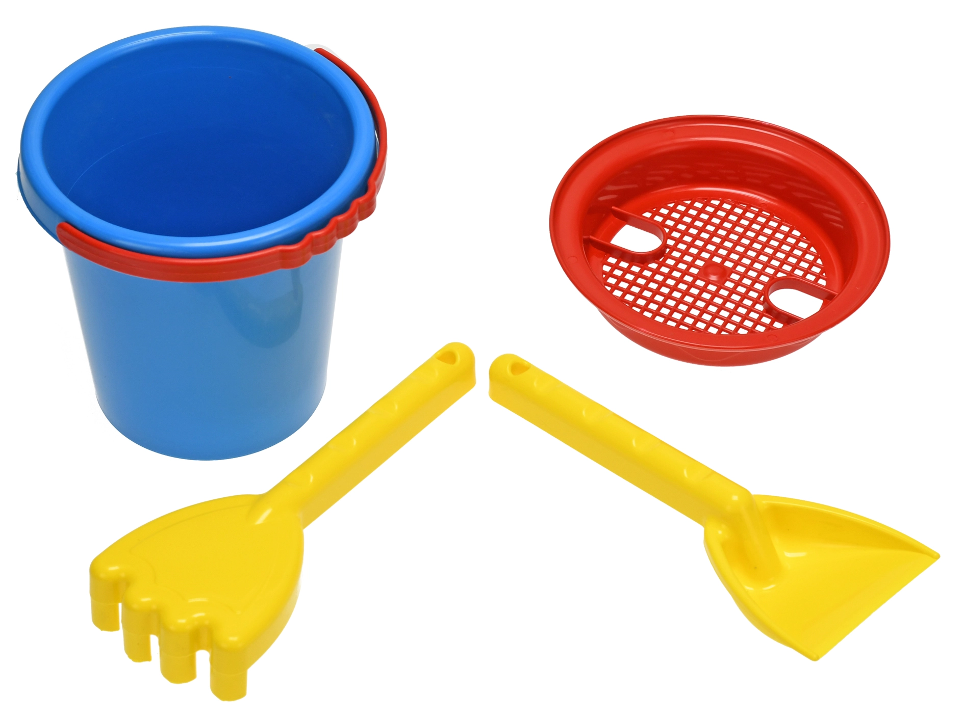 Le seau, le tamis, la pelle et le râteau offrent un équipement complet pour construire gâteaux de sable, châteaux et barrages dans le bac à sable ou sur la plage.
