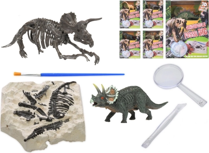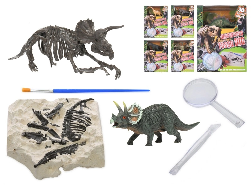 - Bloc de plâtre avec fossile, burin, loupe, pinceau, figurine de dinosaure