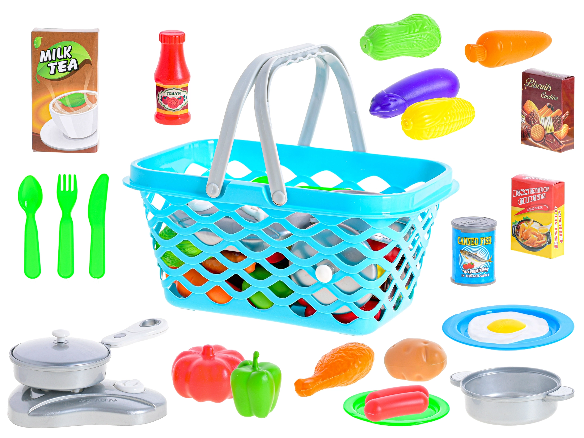 - Panier, réchaud, casserole, poêle, couverts, assiettes, modèles d’aliments