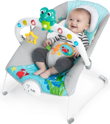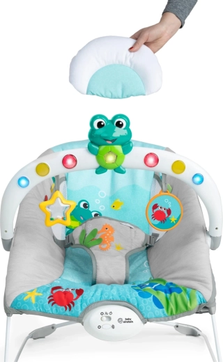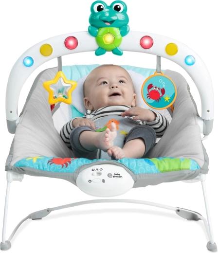 Le transat BABY EINSTEIN Ocean Explorers Kick to It Neptune est conçu pour apaiser et stimuler les sens. Le jouet interactif avec grenouille et miroir, le hochet en forme d’étoile et les rubans colorés encouragent la motricité fine, la perception visuelle et la découverte de soi. Les vibrations intégrées et les mélodies aident à calmer bébé, tandis que la structure stable et le harnais de sécurité offrent une confiance maximale pendant le repos et le jeu.