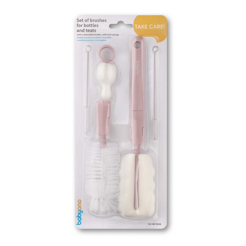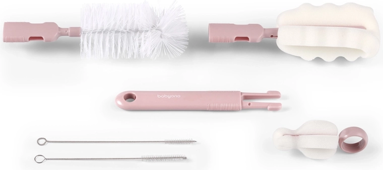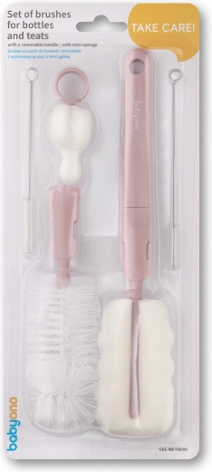 L’ensemble de brosses BABYONO a été conçu pour un nettoyage facile et hygiénique de tous les accessoires d’alimentation et de soin du bébé. Les brosses et éponges interchangeables s’adaptent à la forme du biberon et de la tétine, éliminant ainsi les impuretés même dans les cols étroits et les recoins. Le manche amovible et les trous pour suspension assurent une manipulation confortable et un séchage rapide.