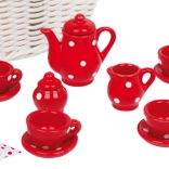 Préparez-vous pour un pique-nique fantastique avec notre set de thé pour enfants. Cet ensemble charmant comprend tout ce dont vous avez besoin – de la théière, des tasses, des assiettes aux pots à lait et sucre, tous fabriqués en céramique durable avec un design joyeux à pois rouges et blancs. Les 17 pièces sont soigneusement rangées dans un élégant panier en osier avec des serviettes en tissu.