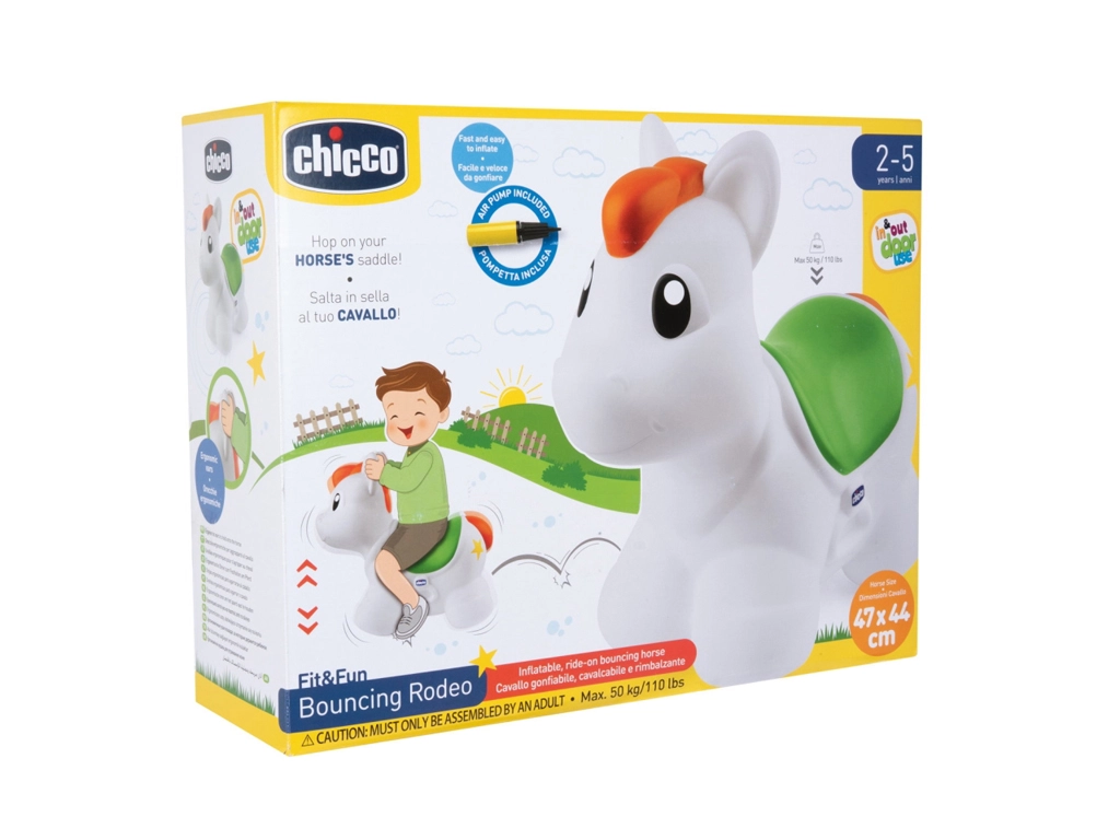 Le cheval sauteur gonflable CHICCO Rodeo est le compagnon idéal pour les premiers sauts et impulsions. Grâce à ses formes lisses, ses bords arrondis et sa sellette ergonomique, l’assise est confortable et la conduite stable. Le jouet se gonfle facilement et rapidement à l’aide de la pompe manuelle fournie, il est donc prêt à jouer en un rien de temps.