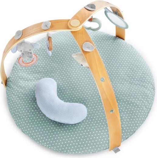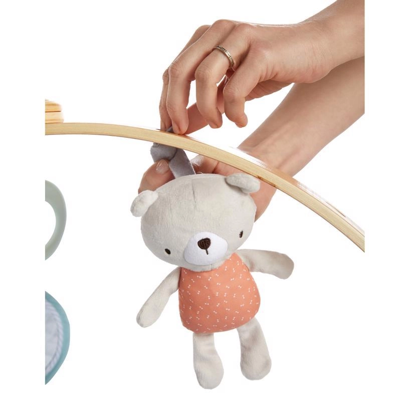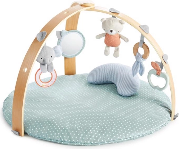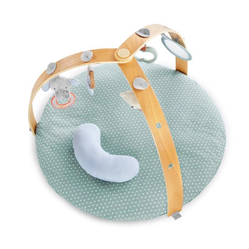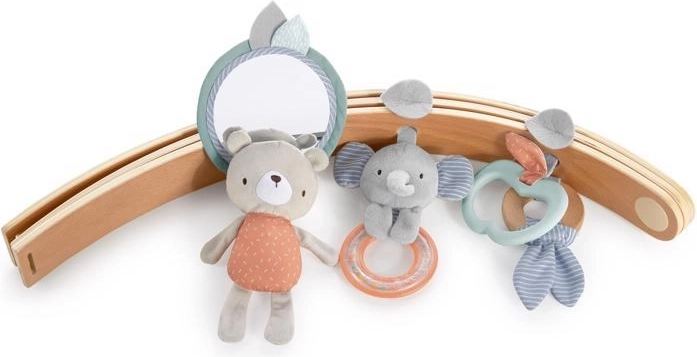 Deux arches croisées au style bois avec petits animaux doux, anneaux de dentition et miroir de sécurité stimulent la vue, le toucher et les premières prises en main.