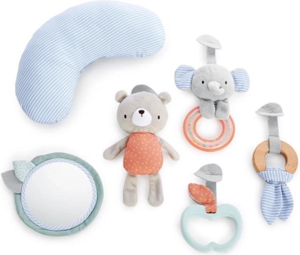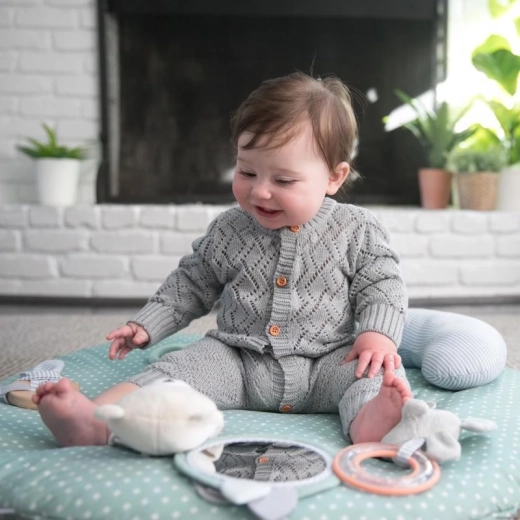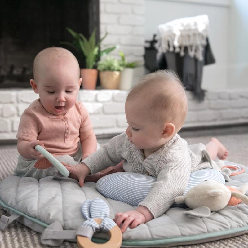 • Stimulation sensorielle – miroir, hochets, anneaux de dentition et textures variées stimulent la vue, l’ouïe et le toucher.