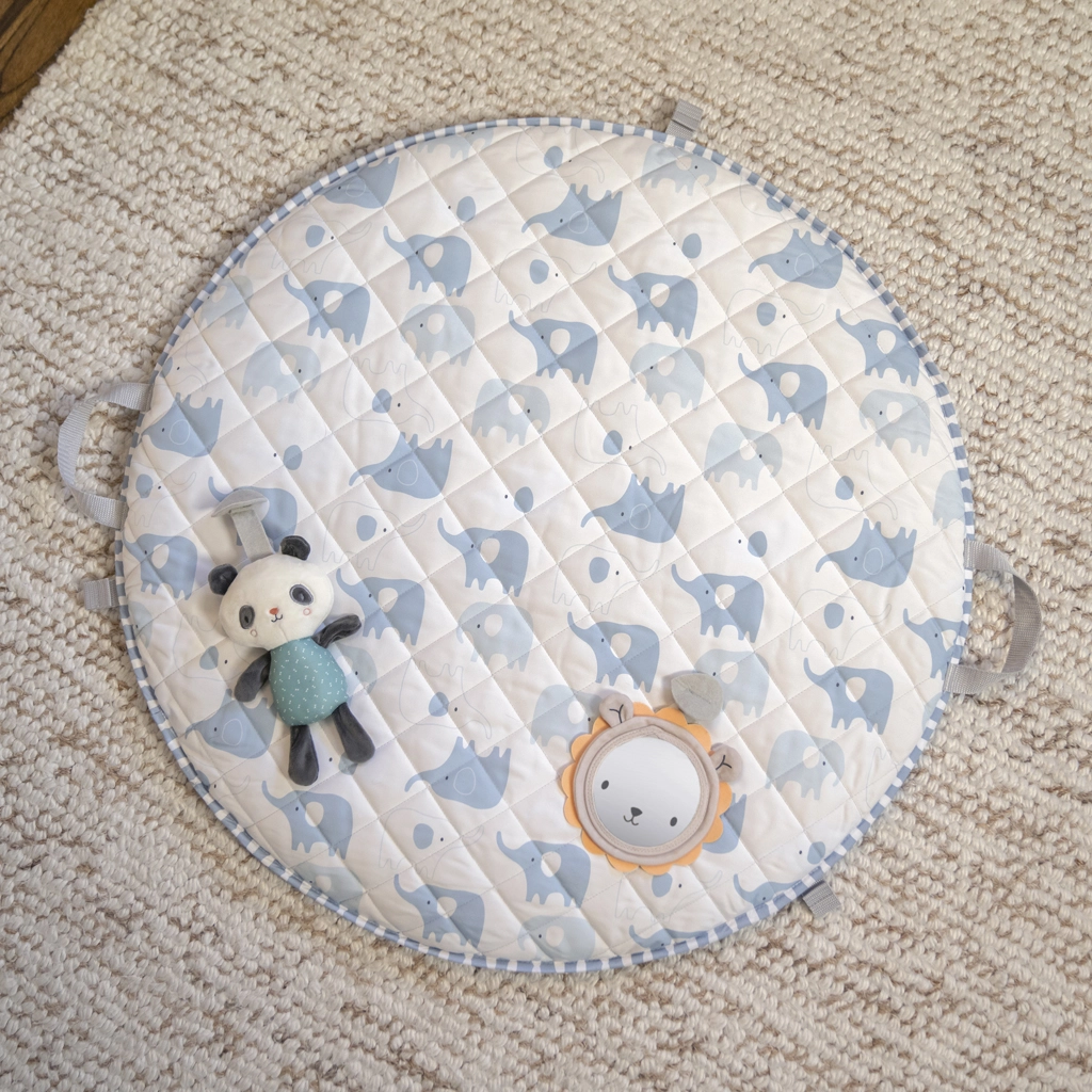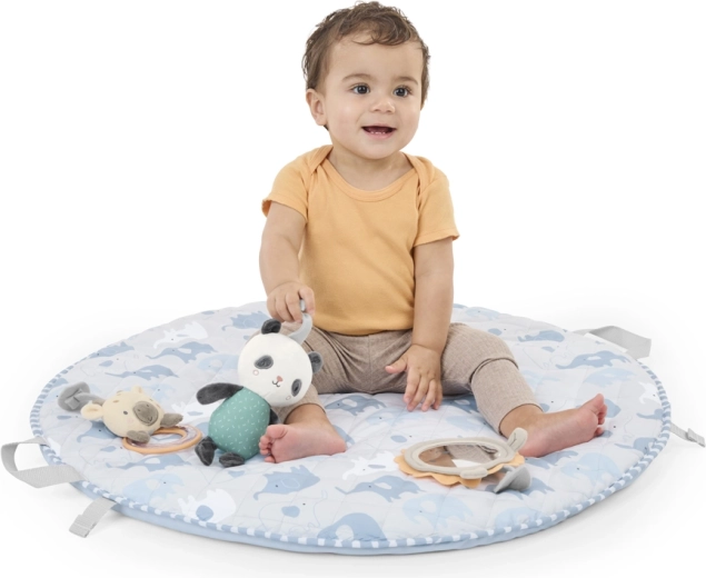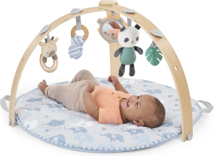 Le sens pratique au quotidien : l’arche SlimFold se replie aisément, le tapis se plie en une “pochette” compacte grâce à ses poignées intégrées, et les housses se lavent facilement en machine. Des matériaux sûrs et des éléments sensoriels intelligemment pensés (miroir, hochet, anneau de dentition, anneau en bois, peluche) éveillent la curiosité et favorisent un jeu apaisé.