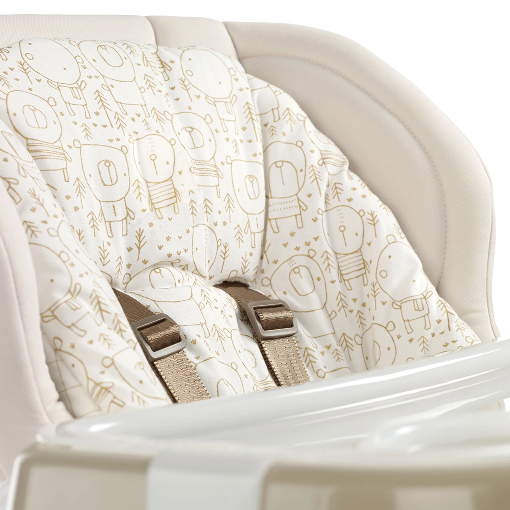 Le plateau amovible à 2 positions et la housse amovible et facile à entretenir facilitent l’usage quotidien. La structure stable avec embouts antidérapants et harnais de sécurité offre confiance et sécurité à chaque activité – que bébé dorme, mange ou se détende. Après utilisation, pliez simplement la chaise en dimensions compactes pour un rangement pratique.
