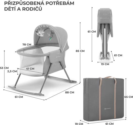 Le lit bébé pratique 3-en-1 KINDERKRAFT Lovi sert de lit, de berceau et de lit de voyage. Il est léger et compact, avec un pliage rapide sans outils, une fonction de balancement, une capote amovible avec moustiquaire intégrée et des côtés en maille respirante pour un sommeil sûr et confortable dès la naissance jusqu’à 9 kg.