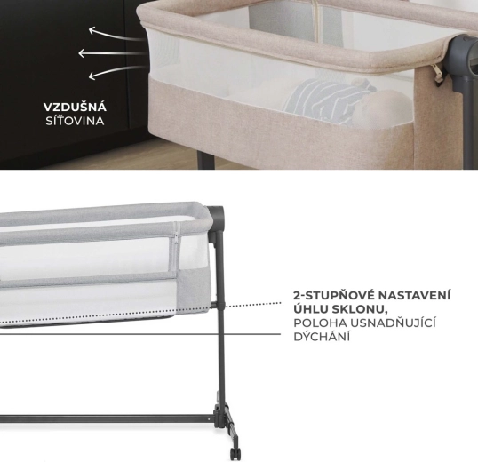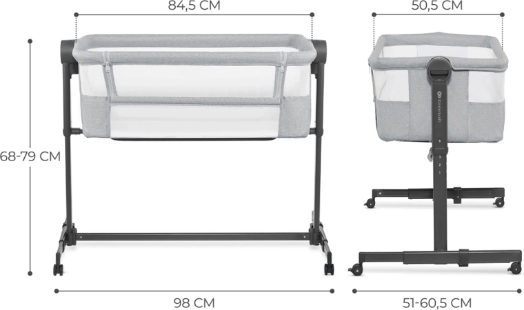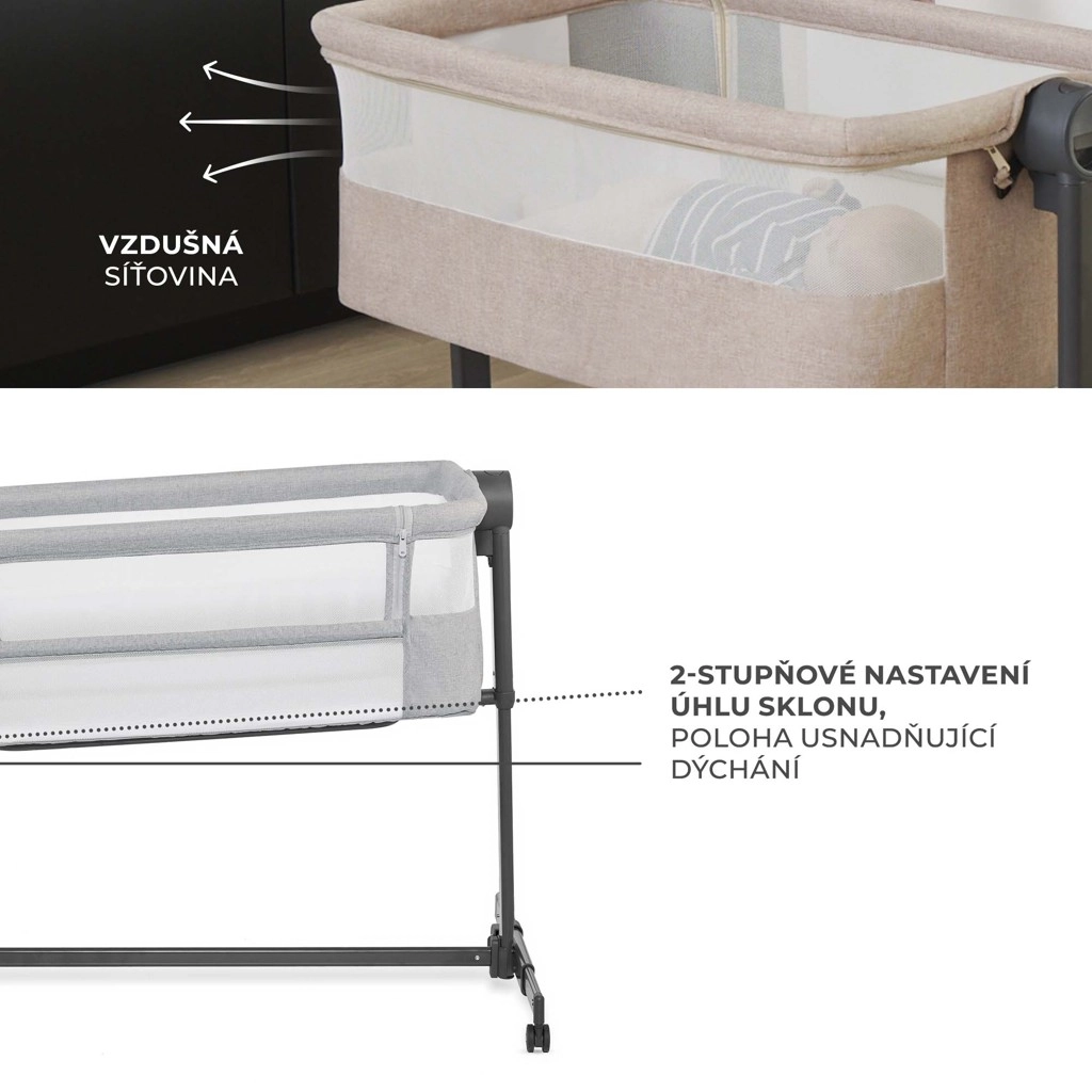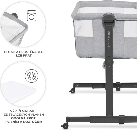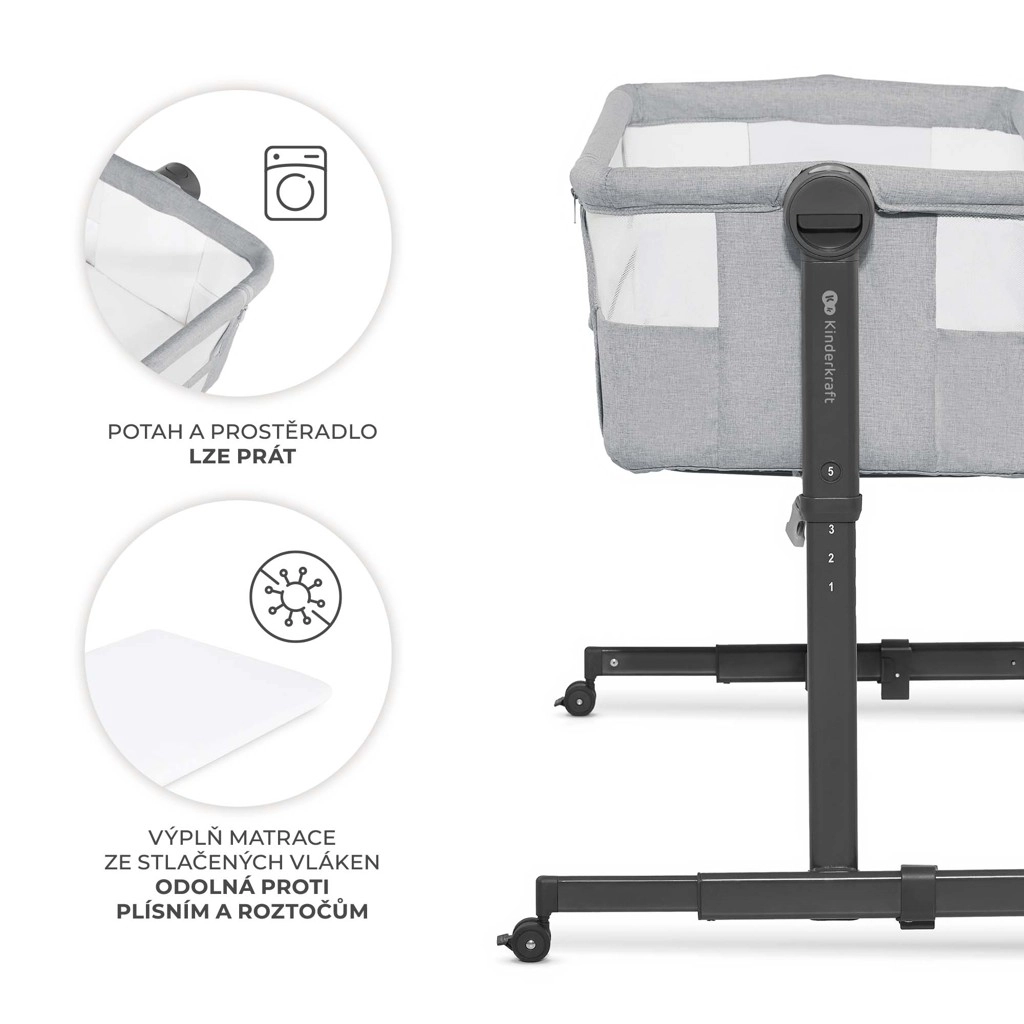 Il comprend un matelas semi-ferme recommandé par des physiothérapeutes – il offre un bon soutien à la colonne vertébrale et à la tête, est résistant à l’humidité, aux moisissures et aux acariens et est fourni avec un drap-housse lavable. L’inclinaison à deux positions aide en cas de rhume ou de régurgitations fréquentes. Quatre roulettes avec blocage facilitent le passage d’une pièce à l’autre, pour garder votre enfant toujours à proximité.