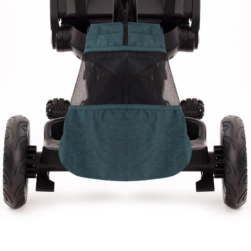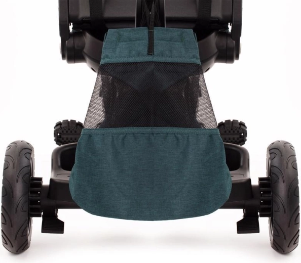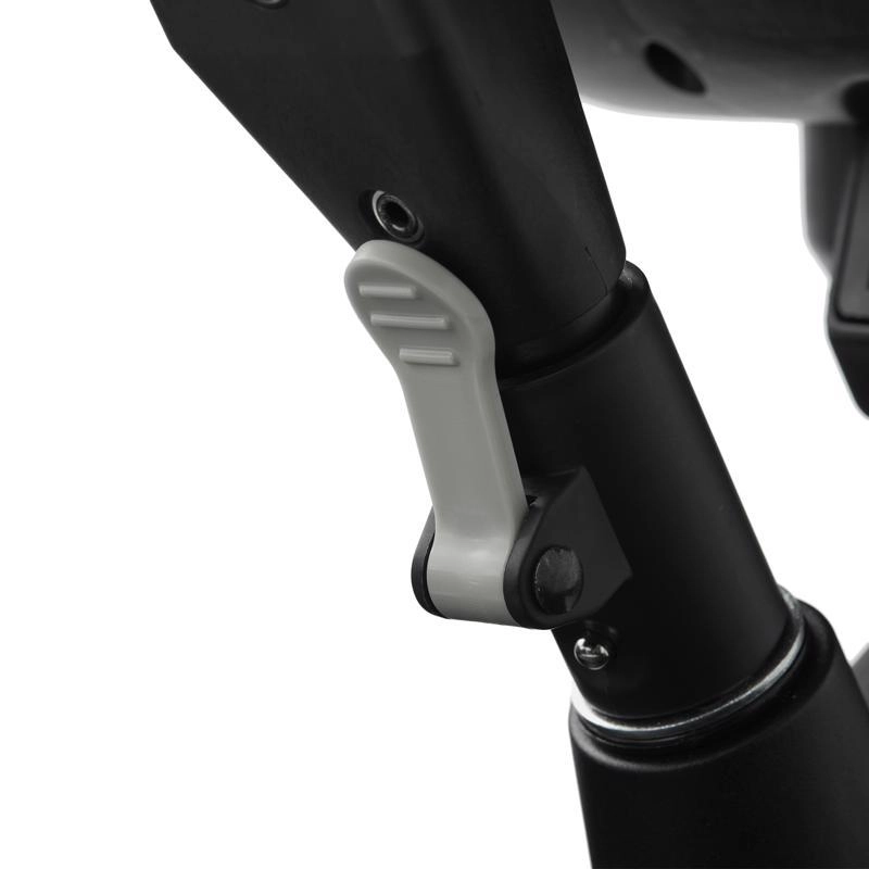 Poignée télescopique avec boutons de réglage rapide, frein de stationnement et accessoires complets : porte-gobelet, sonnette, sac/à dos et panier.