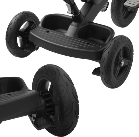 Le cadre en alliage de magnésium est remarquablement léger et rigide, les roues arrière à roulements et les pneus en PU gèrent aussi bien les trottoirs urbains que les chemins de parc. La capote imperméable avec UPF 50+ protège du soleil et de la pluie, tandis que les parents apprécieront la poignée télescopique à commande par boutons pour une direction précise et le frein de stationnement sur les roues arrière. Grâce à la fonction roue libre, les enfants apprennent à pédaler en toute sécurité sans entraîner le tricycle.