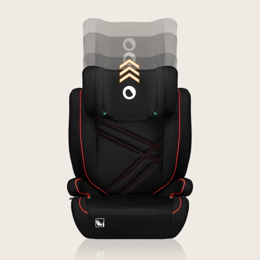 Large assise avec mousse EPE, panneaux en maille respirante et appui-tête à 8 positions garantissent le confort même lors de longs voyages. Les accoudoirs aident à guider correctement la ceinture.